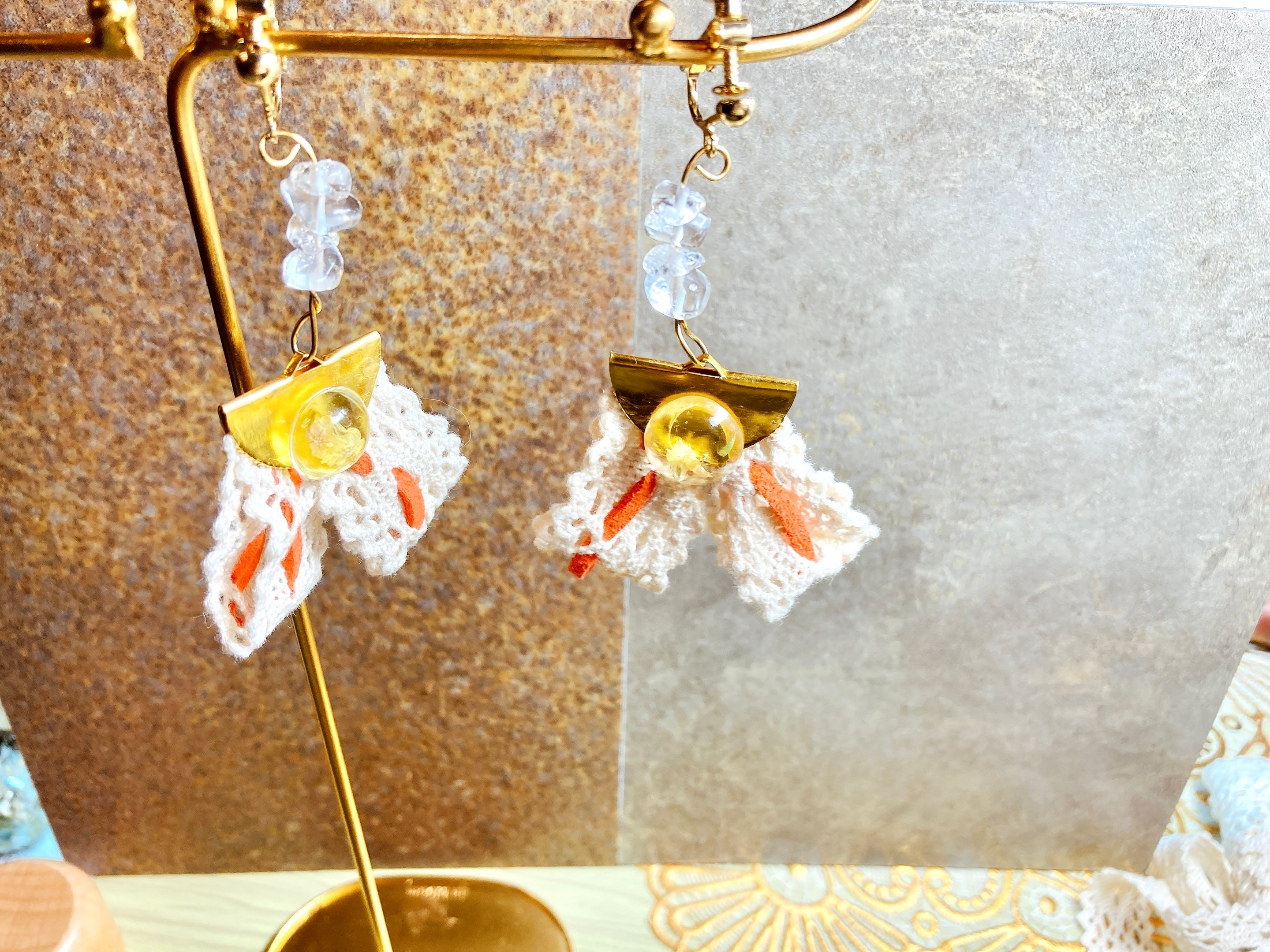 アレルギーフリー金具を使ったレースタッセルのネジバネ式イヤリングです。