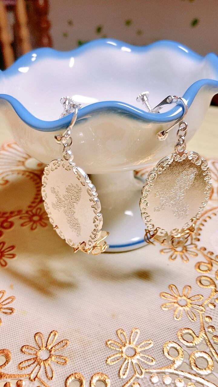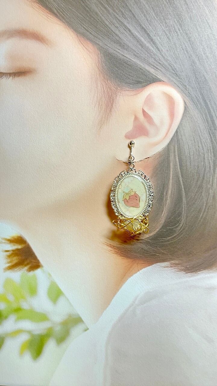 レトロな箔押し苺のアレルギーフリー金具ネジバネ式イヤリングです。