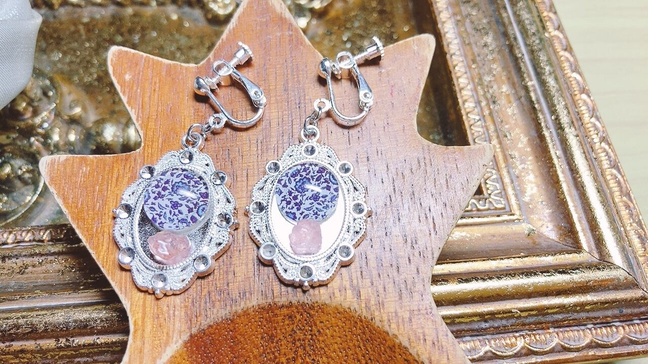 アレルギーフリー金具を使ったミール皿天然石ストロベリークォーツのイヤリング。