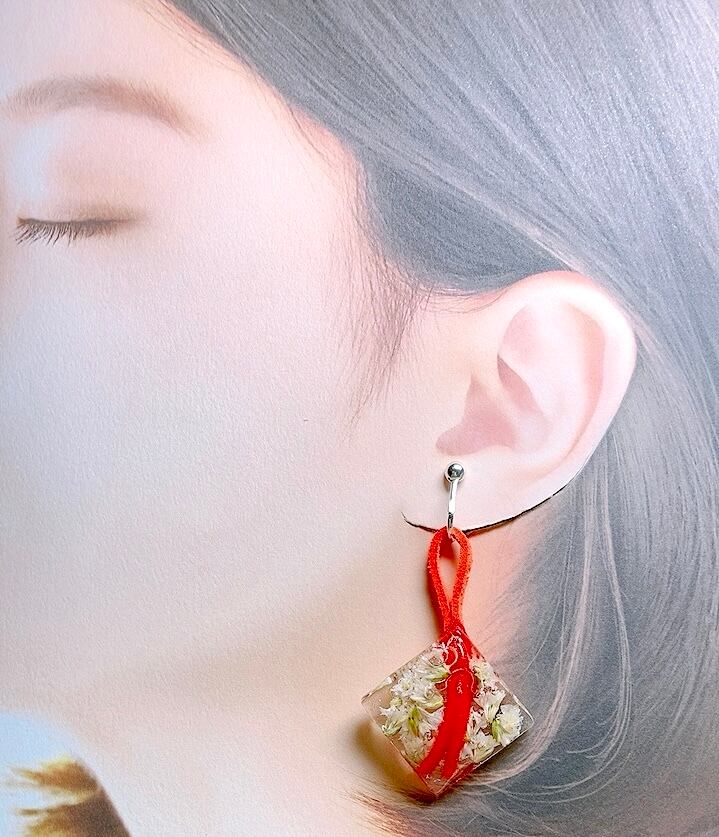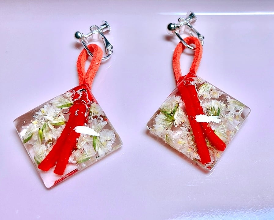 スターチスとオレンジ色の合皮革を使ったレジンイヤリング。気泡は自然美のアクセントに使っています。オレンジ色の合皮革はレジンの中の色だけ写真のとおり赤色に見えます。