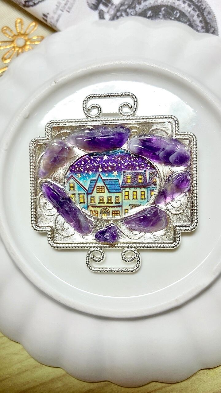 レトロな西洋ハウス箔押しデザインに天然石アメジストをあしらったブローチです。少し黄色がかった黄昏時と夜の入り混じった作品です。