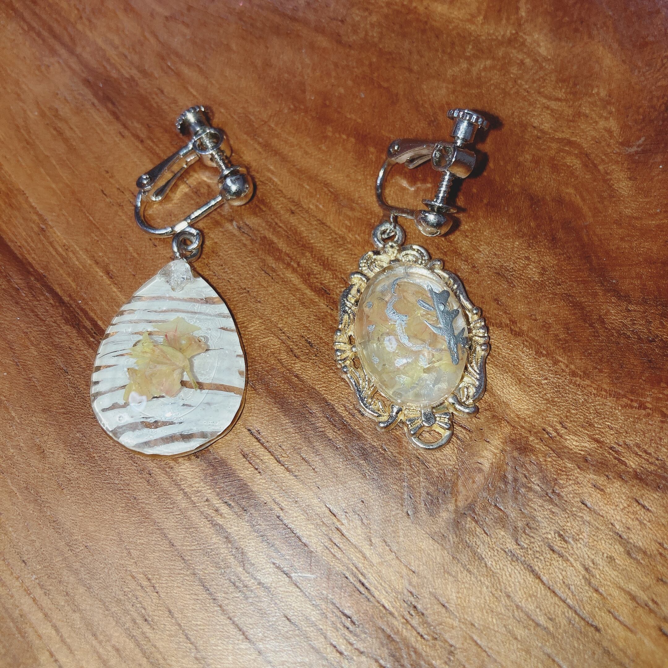 左右違いレトロ自家製ドライフラワーイヤリング