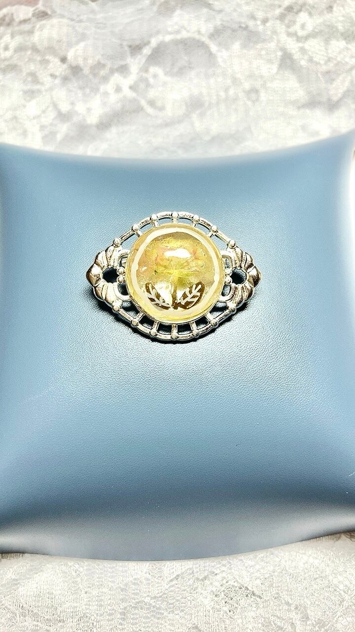 スターチスで作った黄色のドライフラワー入りのレトロミール皿のブローチです。