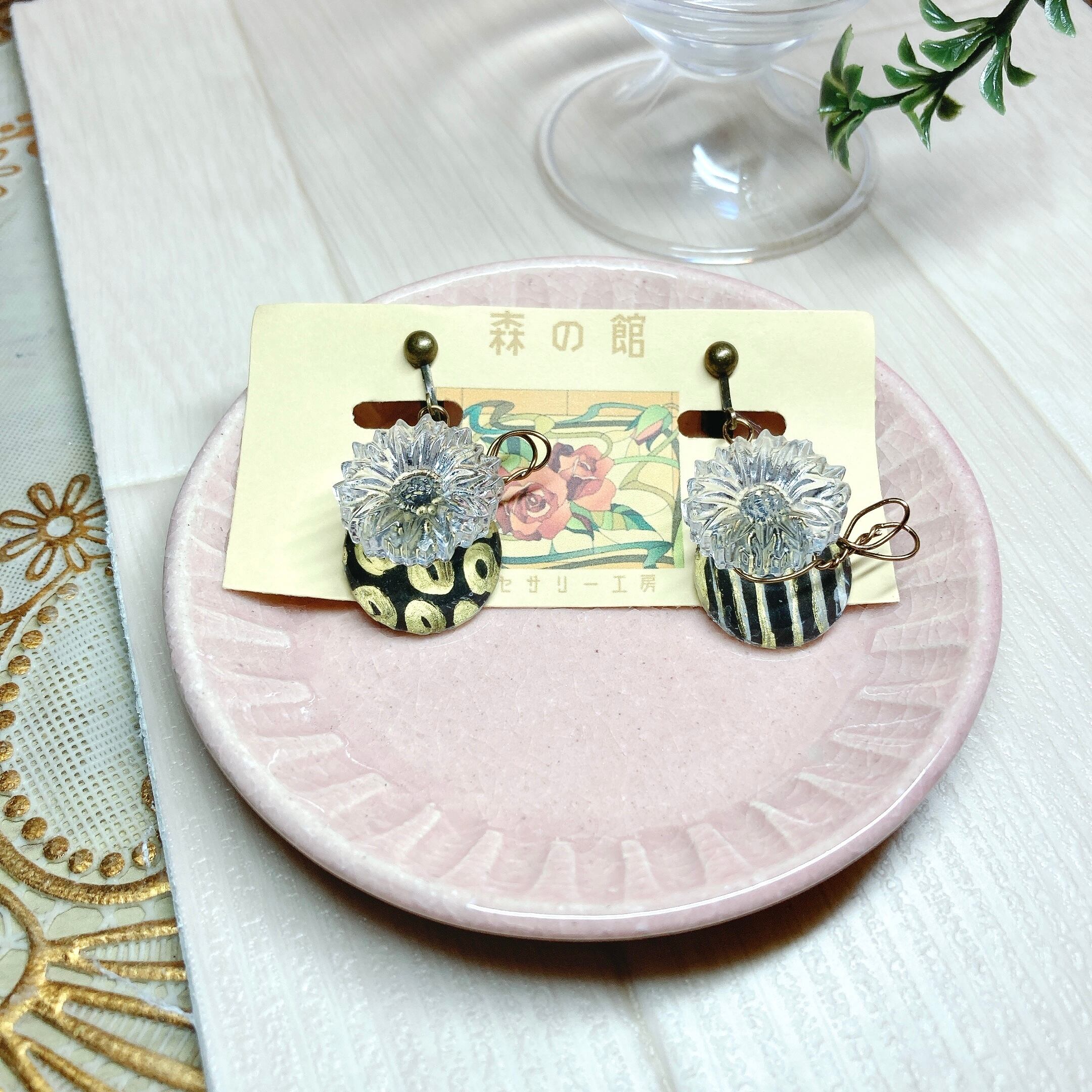 オリジナル手描きカボションに透明のお花のレジンパーツをくっ付けて製作しました。