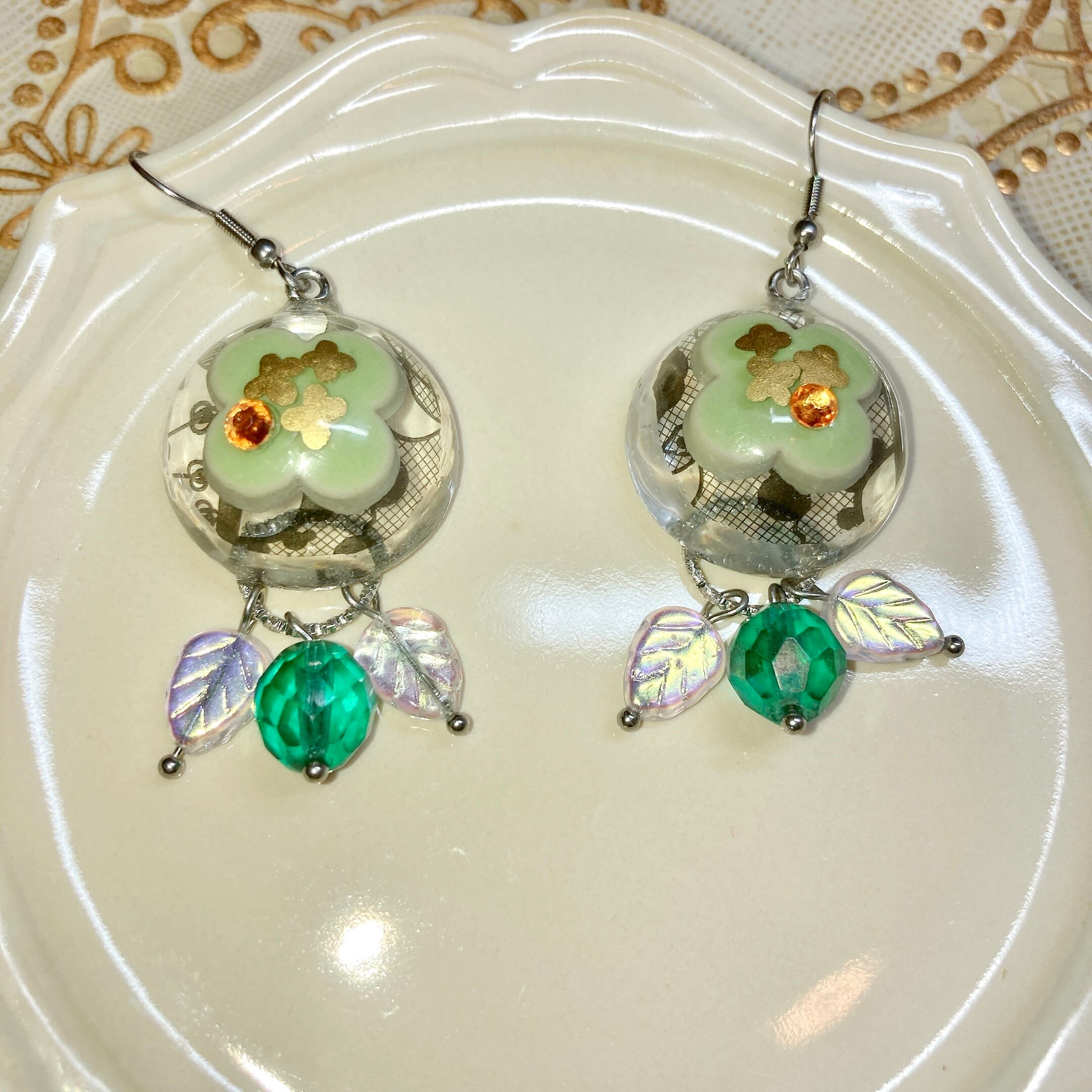 美濃焼にゴールド色の花を描いた花レースピアスです。