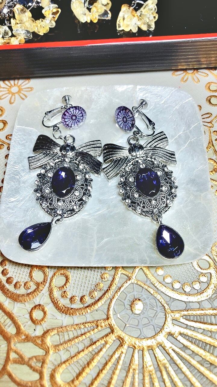 【送料無料】レトロジュエリーデザイン!リボンイヤリング 濃藍色