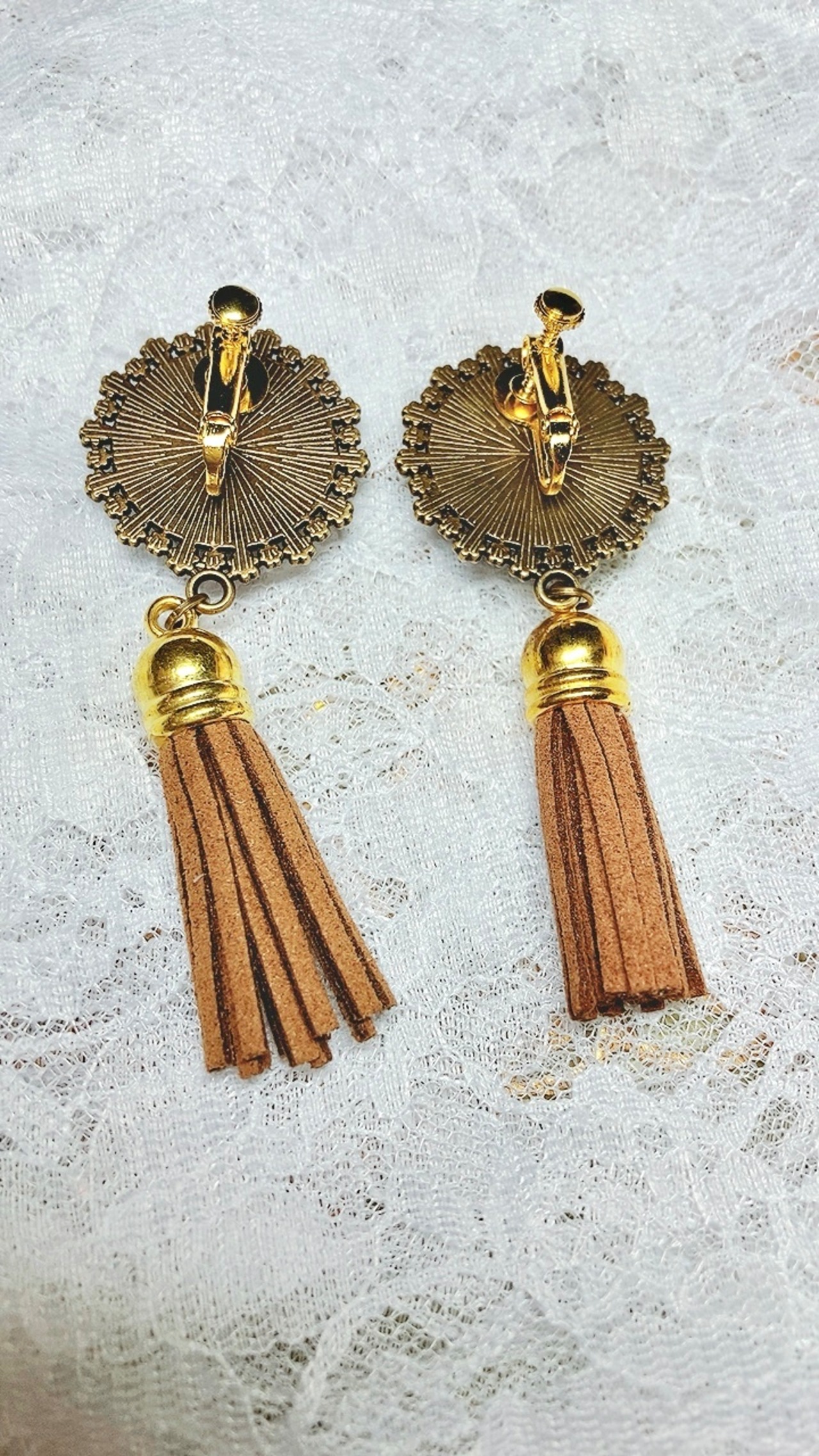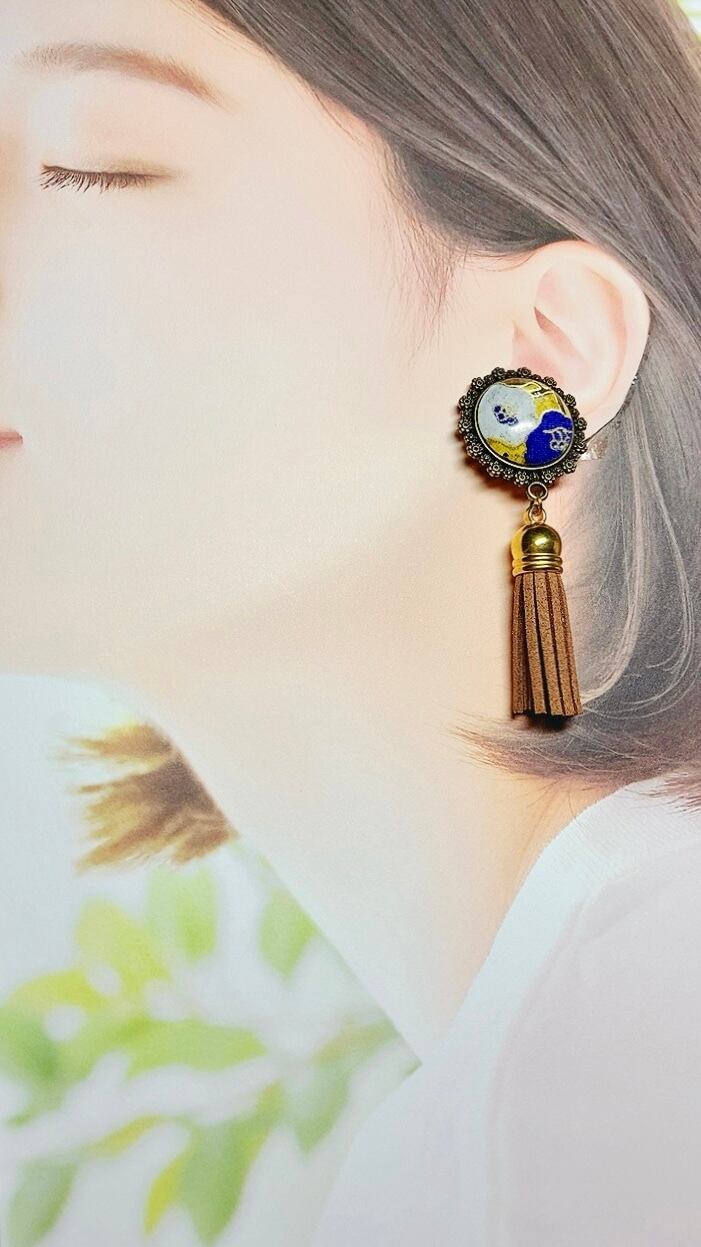 華やかな友禅染柄にベロア素材のタッセルが揺らぐイヤリングです。