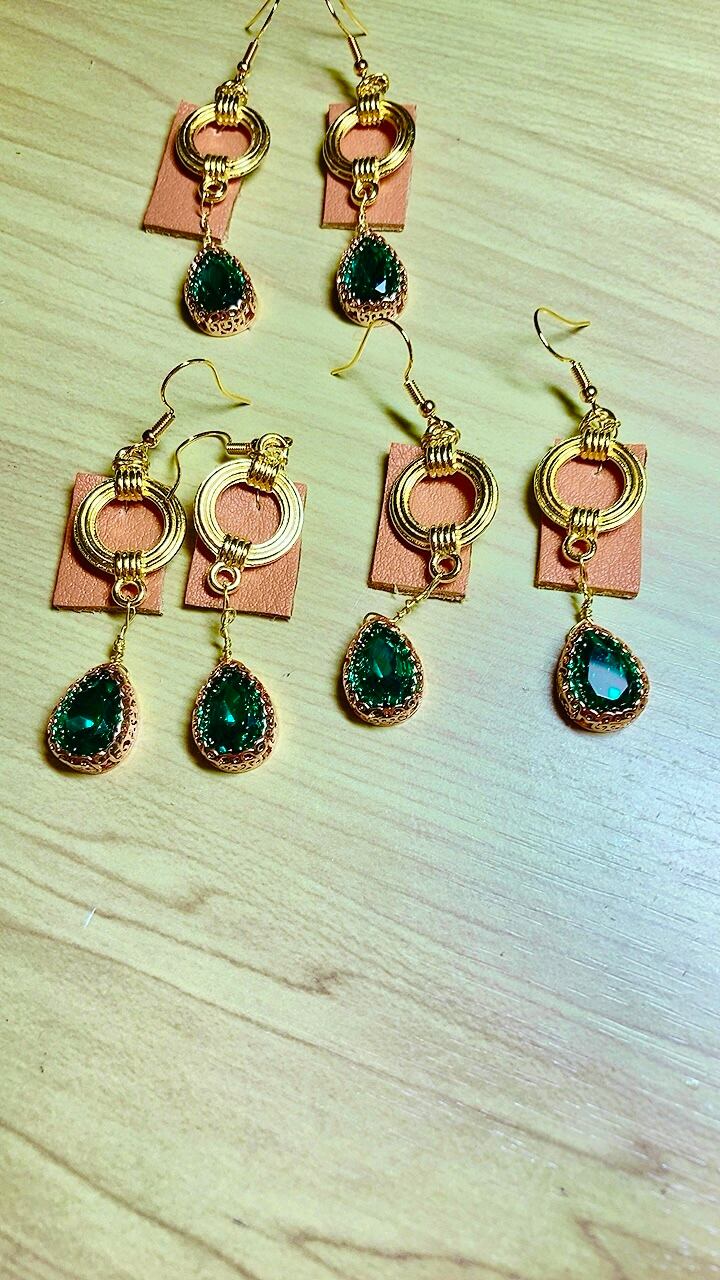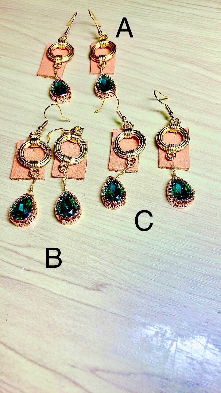 揺れるグリーンのガラスビジューが綺麗です。揺れの邪魔になったり摩擦で牛革が傷つくのを避けるため、このデザインとなりました。