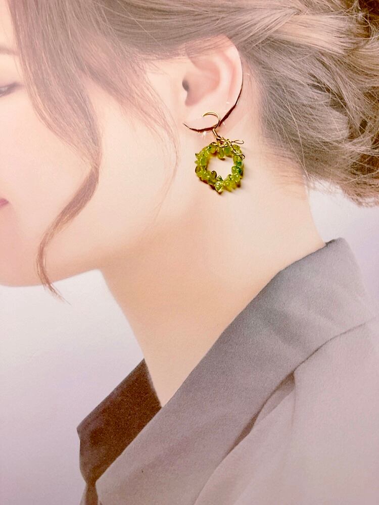 シンプルなリースの天然石が煌びやかなゴールドリボンをまとい貴方の耳を彩ります。