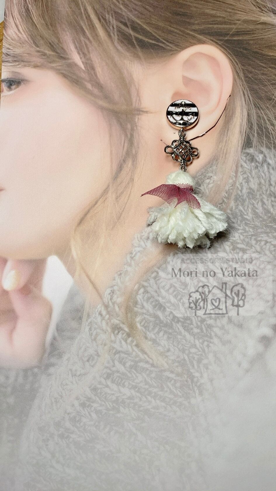 ウィンターマリンボタンがオシャレな、白い毛糸に冬の温もりを感じるイヤリングです。