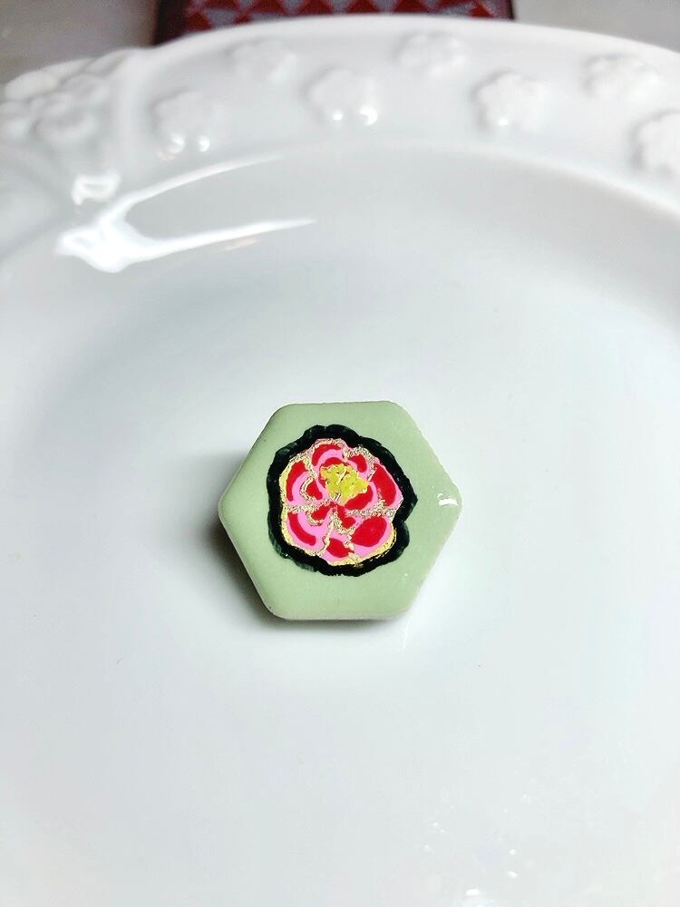 薄黄緑イメージの美濃焼タイルに椿の絵を描いてレジンコーティングしました。