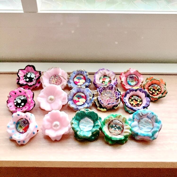 淡いピンクの元の色を残して花弁の先に様々な色を付けた八重桜。その真ん中に和柄ガラスカボションを付けました。