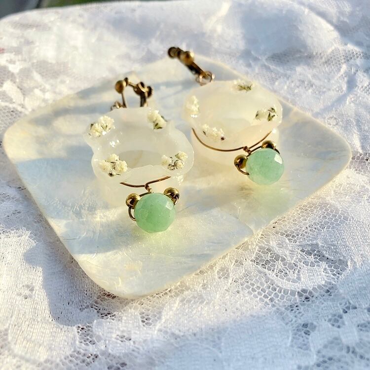 【送料無料】自作花パーツ達の64面カット10mmアベンチュリンのイヤアクセ
