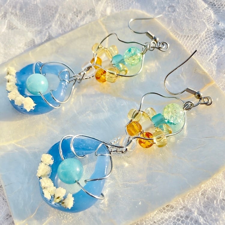 半透明粘土パーツの真ん中に天然石アクアマリンを配置し、イヤアクセ金具までワイヤー一本巻きで繋げました♪