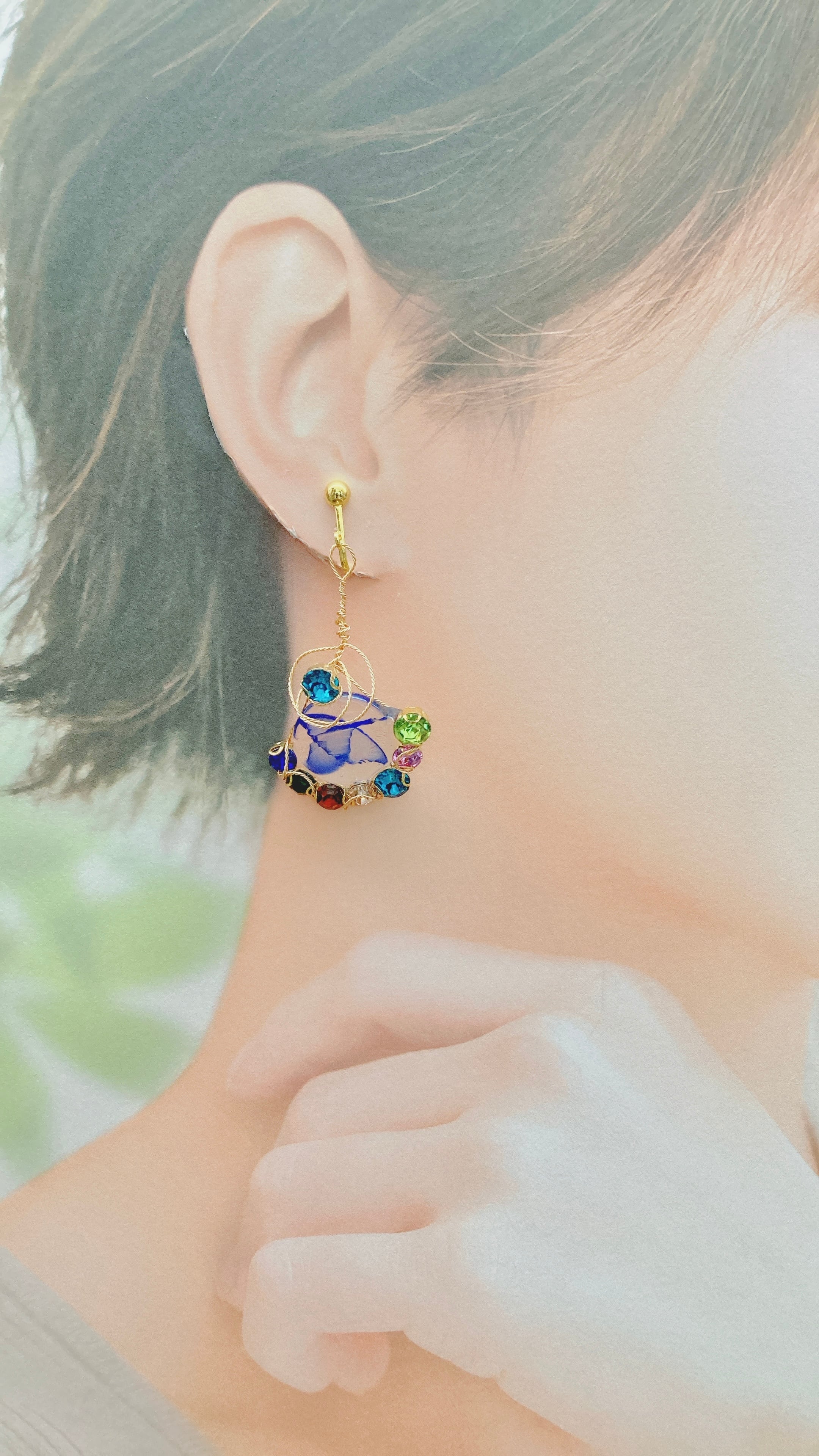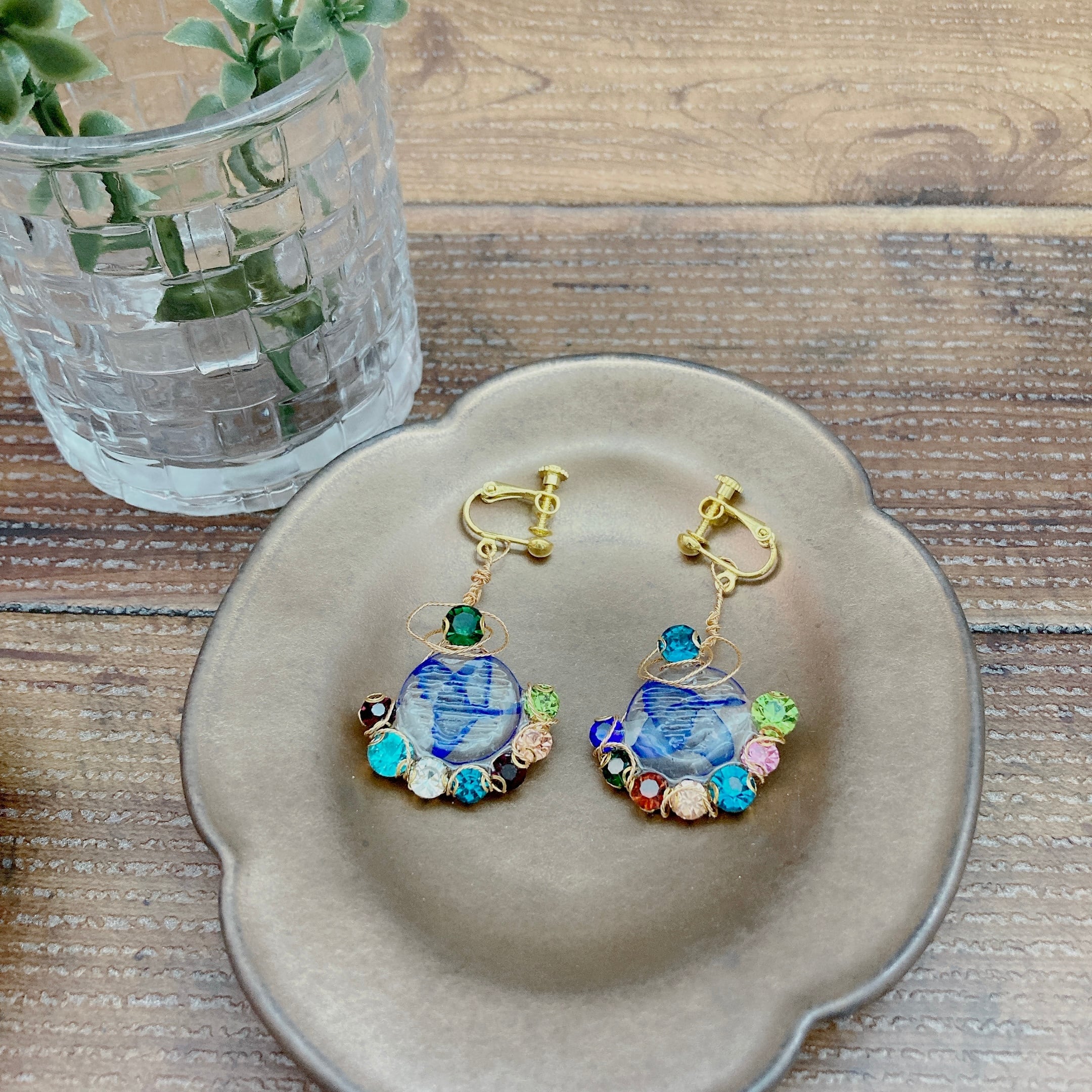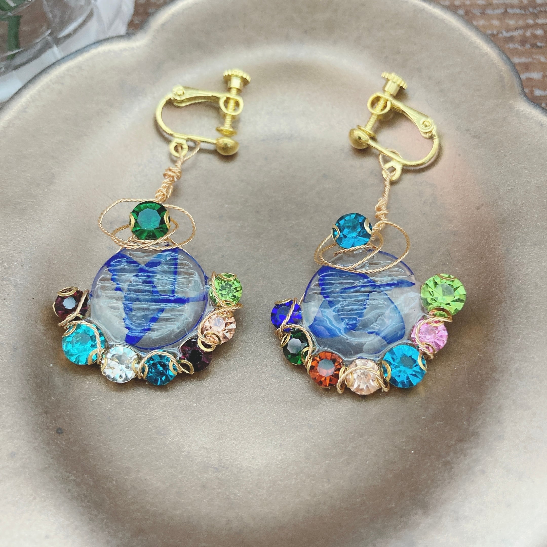 華やかな装いに欠かせないカラフルビジューイヤリングが登場しました!ぷっくりとしたおはじき硝子に、キラキラと輝くビジューが散りばめられたデザインは、まさに一点もの。付けるだけで、普段のコーディネートが一気に華やかな印象に変わります。