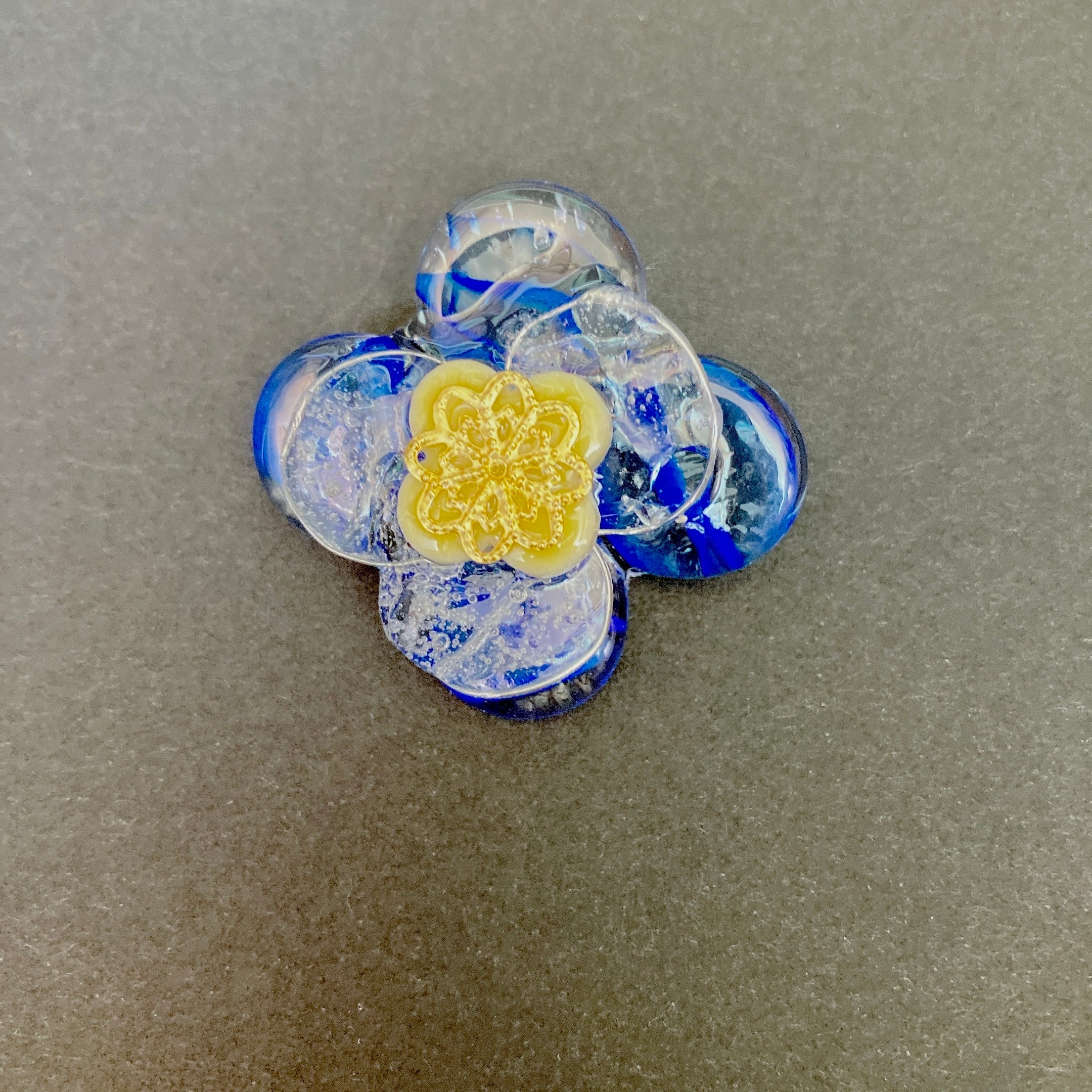 そんなレトロな気泡ガラスをカメリアの花びらの一部にレジンで再現したブローチが登場しました。