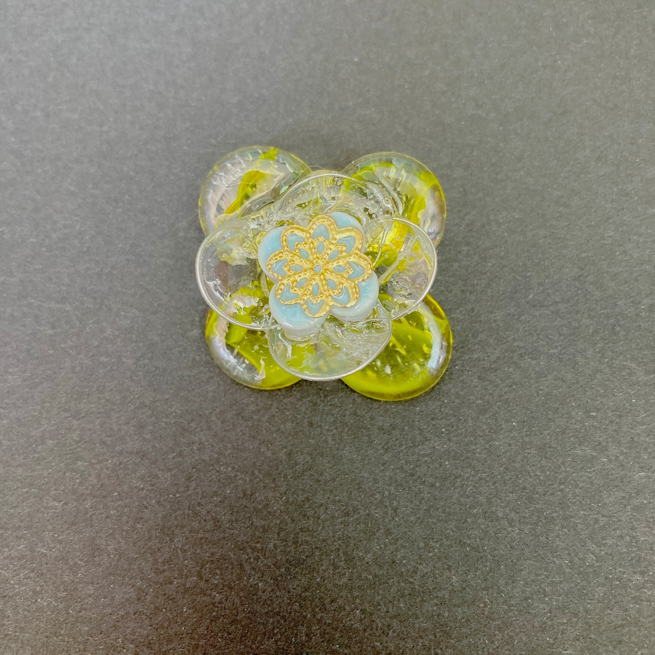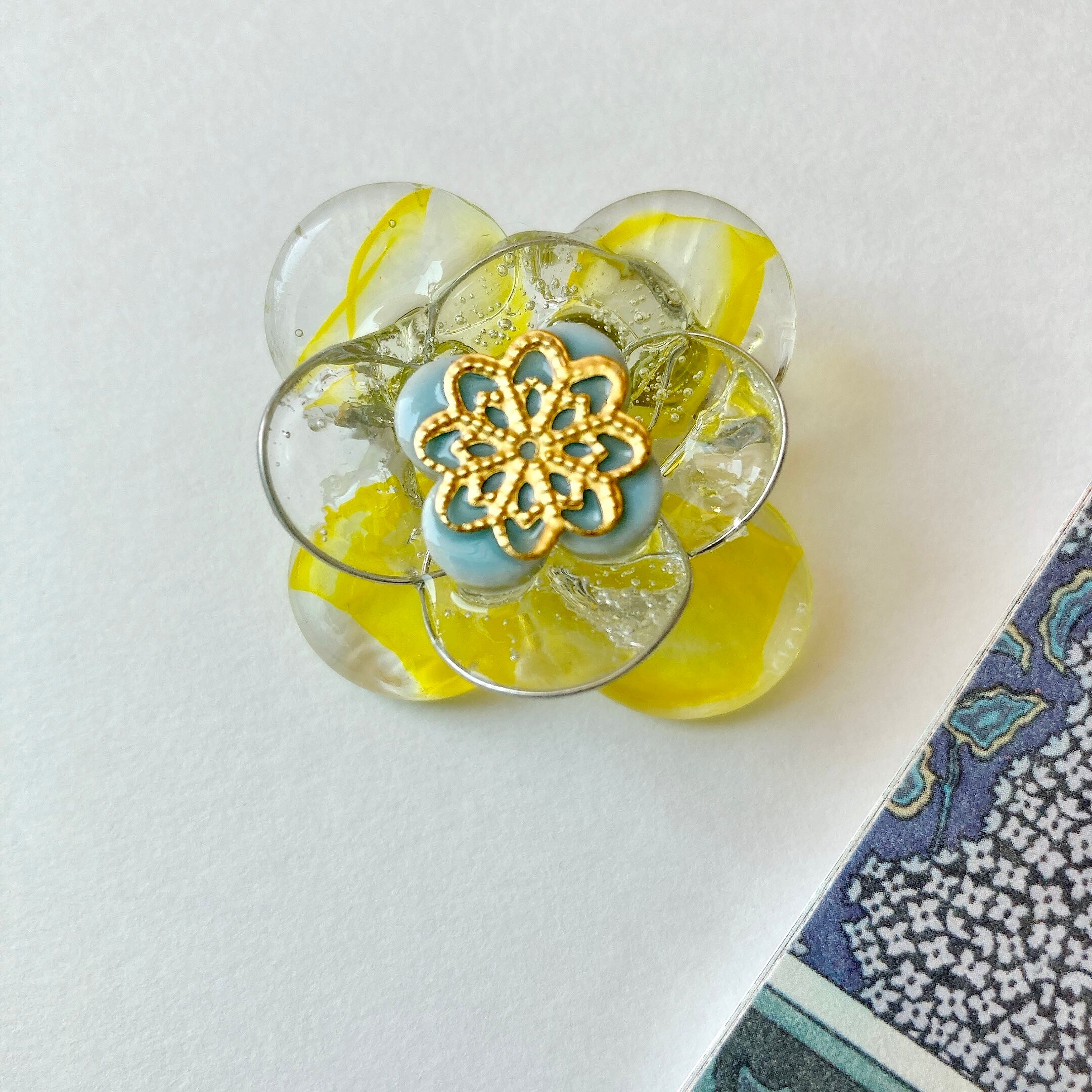 そんなレトロな気泡ガラスをカメリアの花びらの一部にレジンで再現したブローチが登場しました。