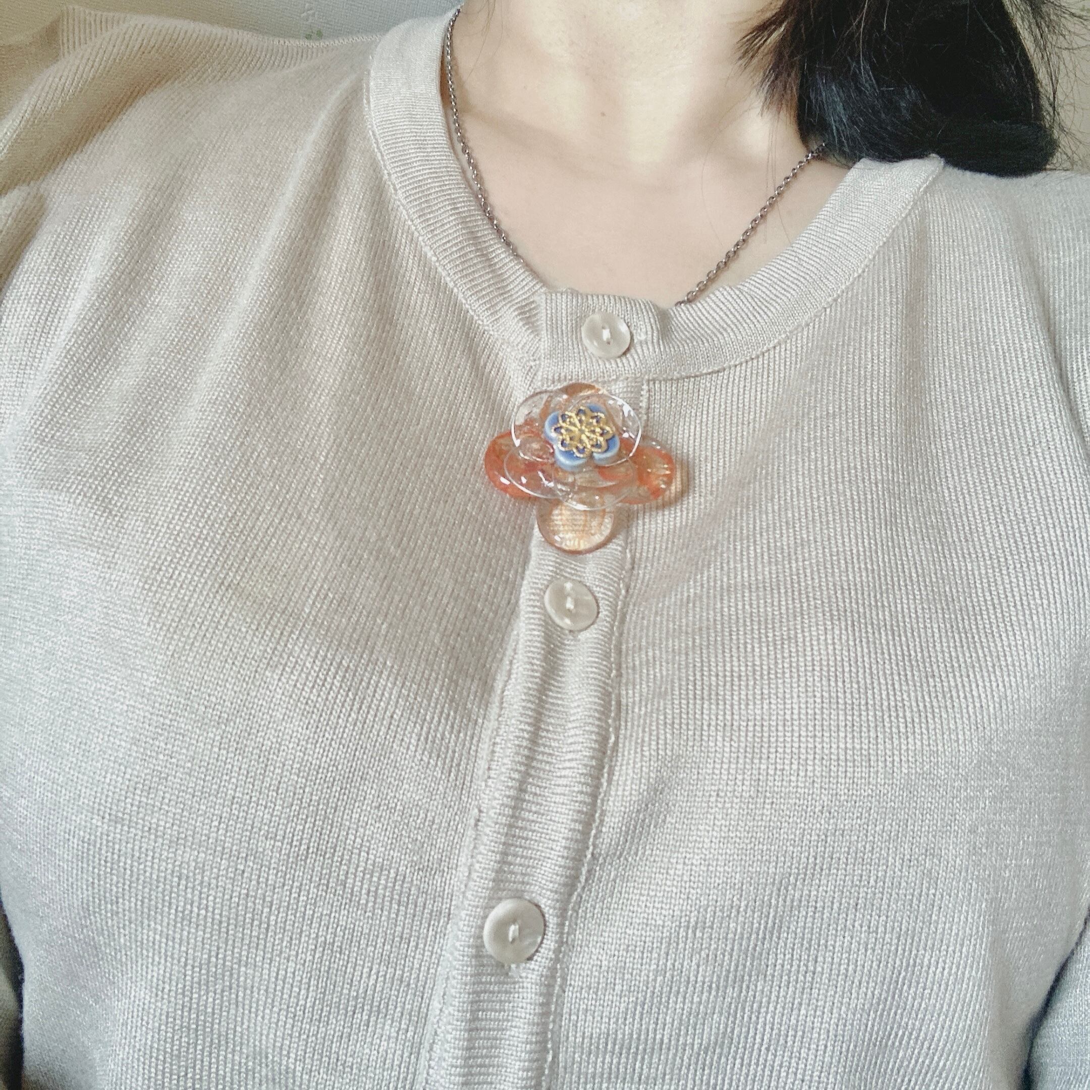 そんなレトロな気泡ガラスをカメリアの花びらの一部にレジンで再現したブローチが登場しました。