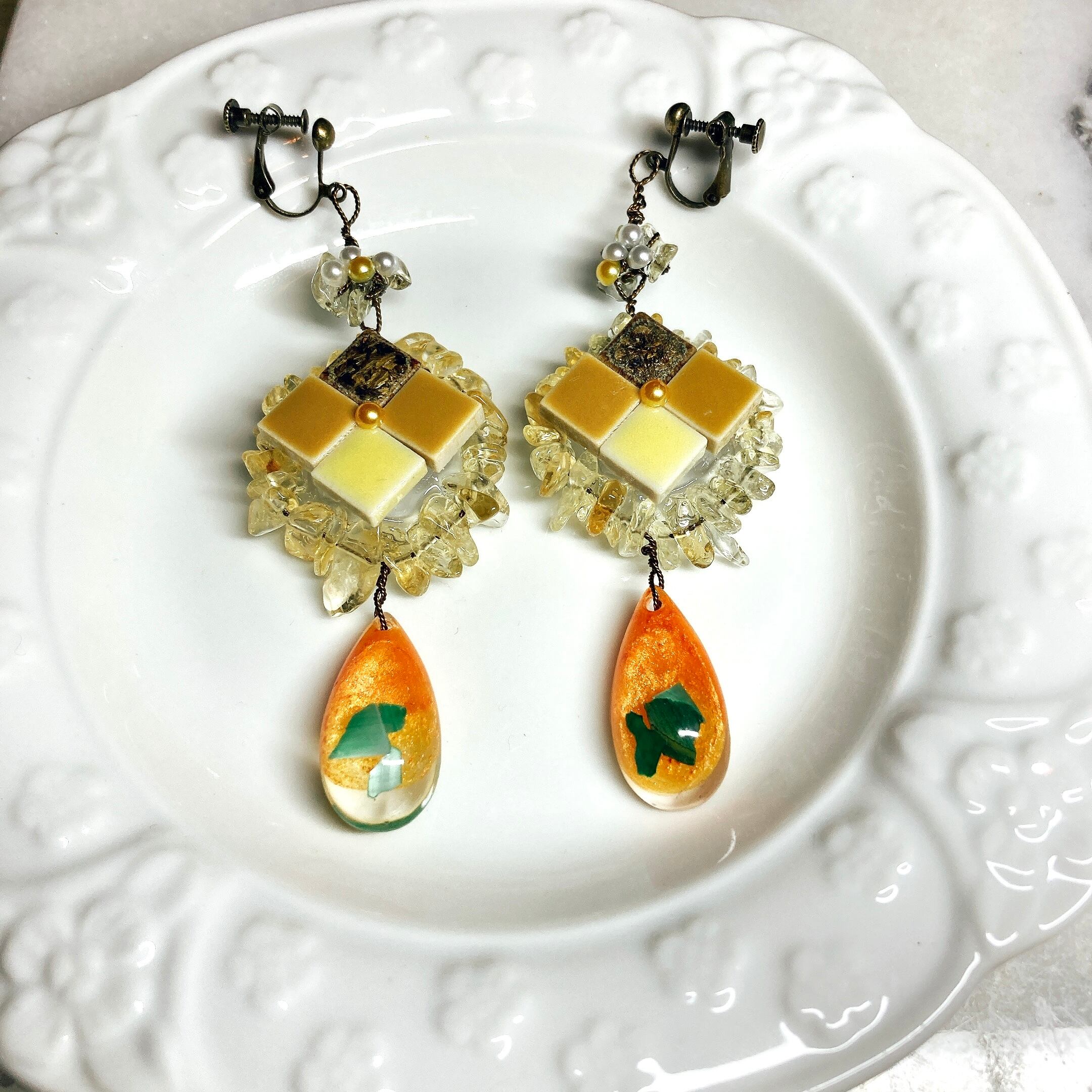 レジン土台には、天然石のシトリンを使用し、つぼみと咲いた花房を表現しています。一粒一粒のシトリンは、黄金色に輝き、とても上品な印象に仕上がっています。