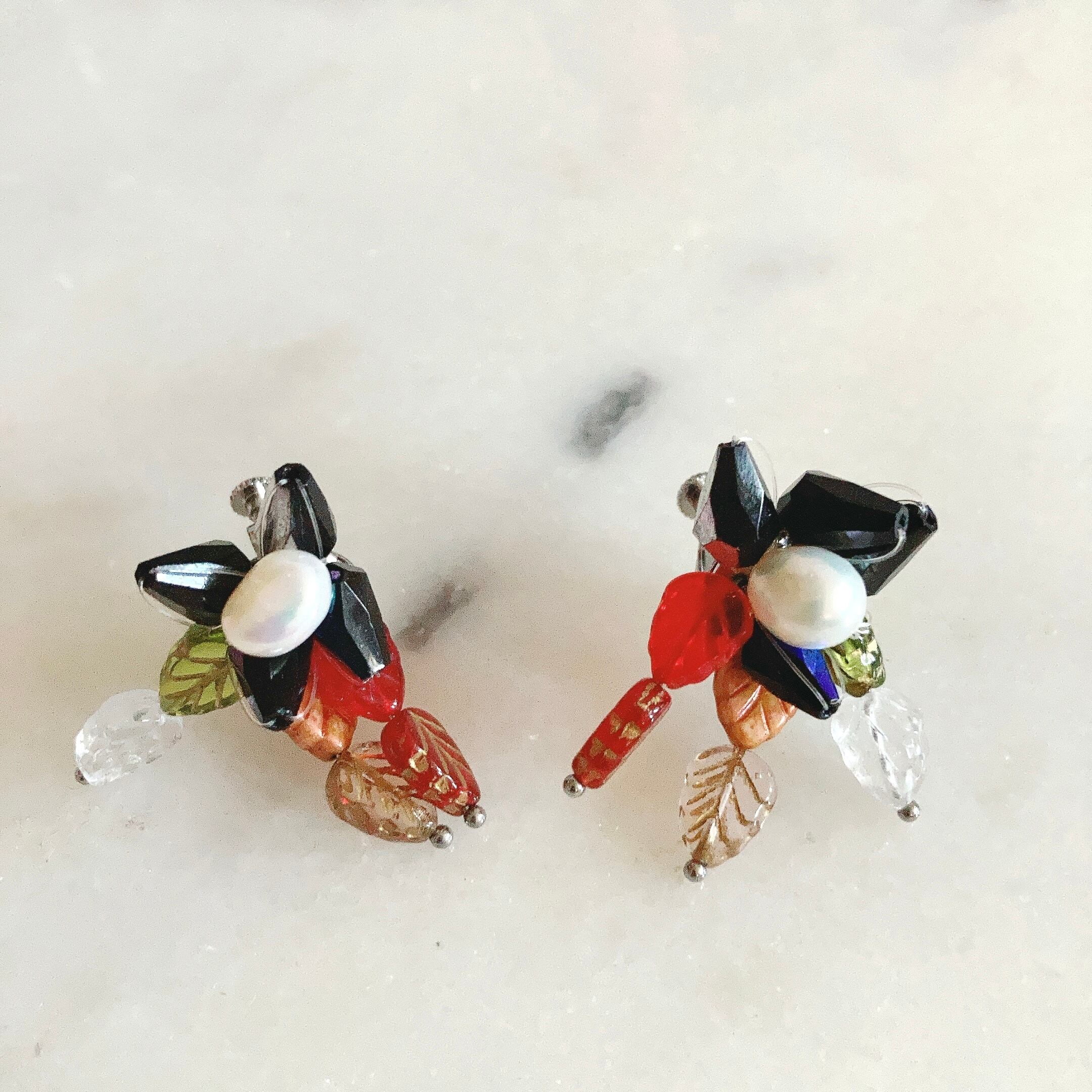 森の黒い花、葉っぱの大粒淡水パールチェコガラスイヤリング