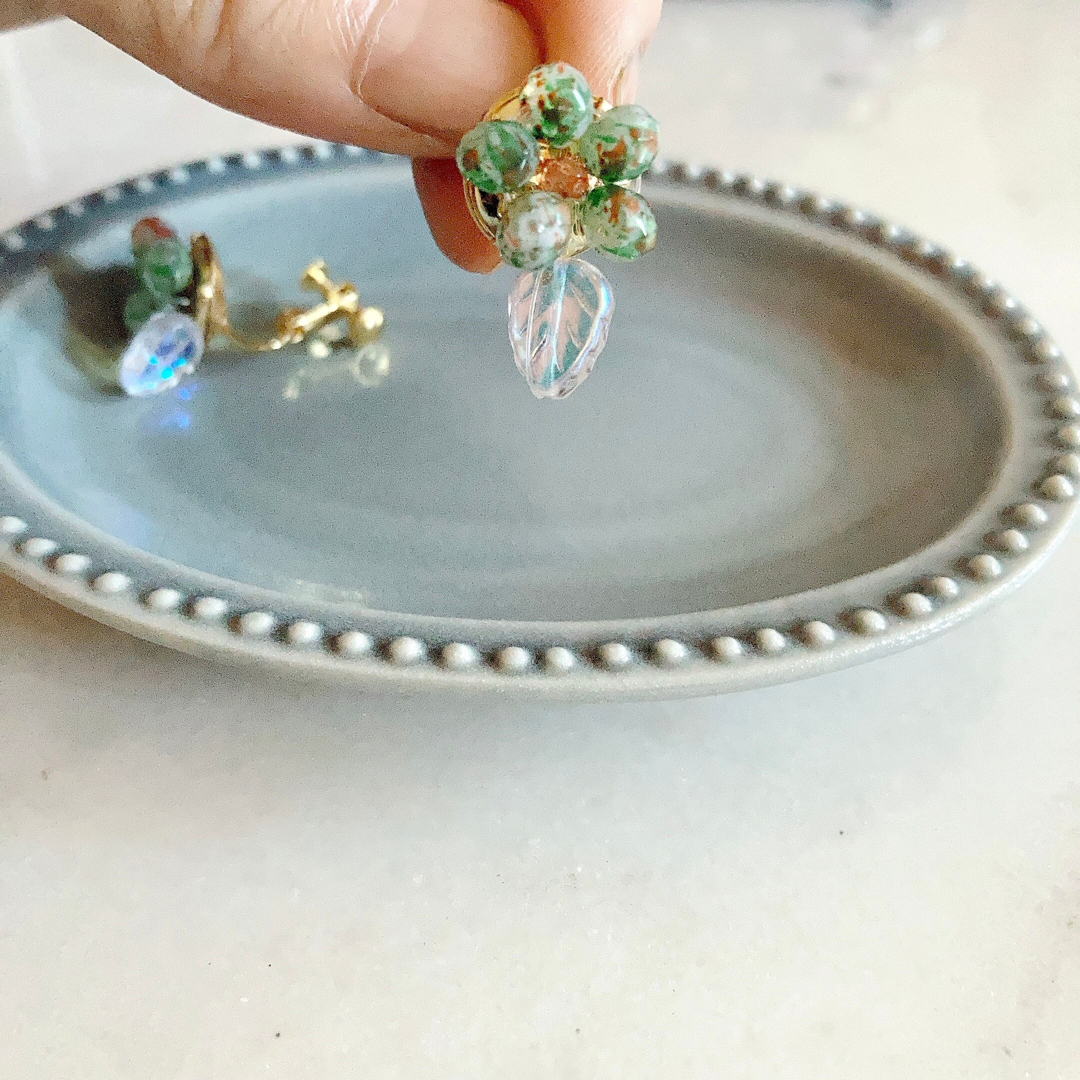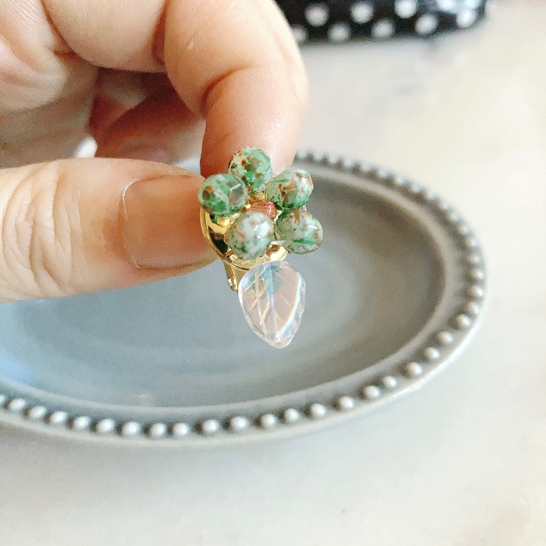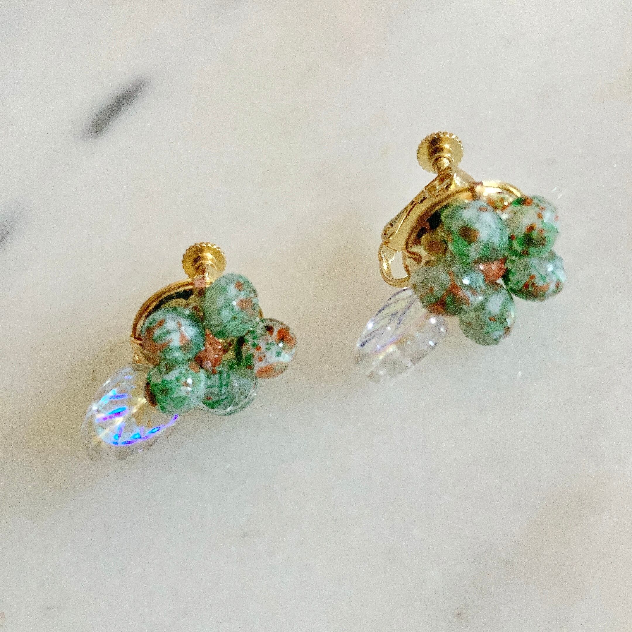 蒼緑のスプレー硝子とチェコ硝子のイヤリングは、レトロな雰囲気が魅力です。