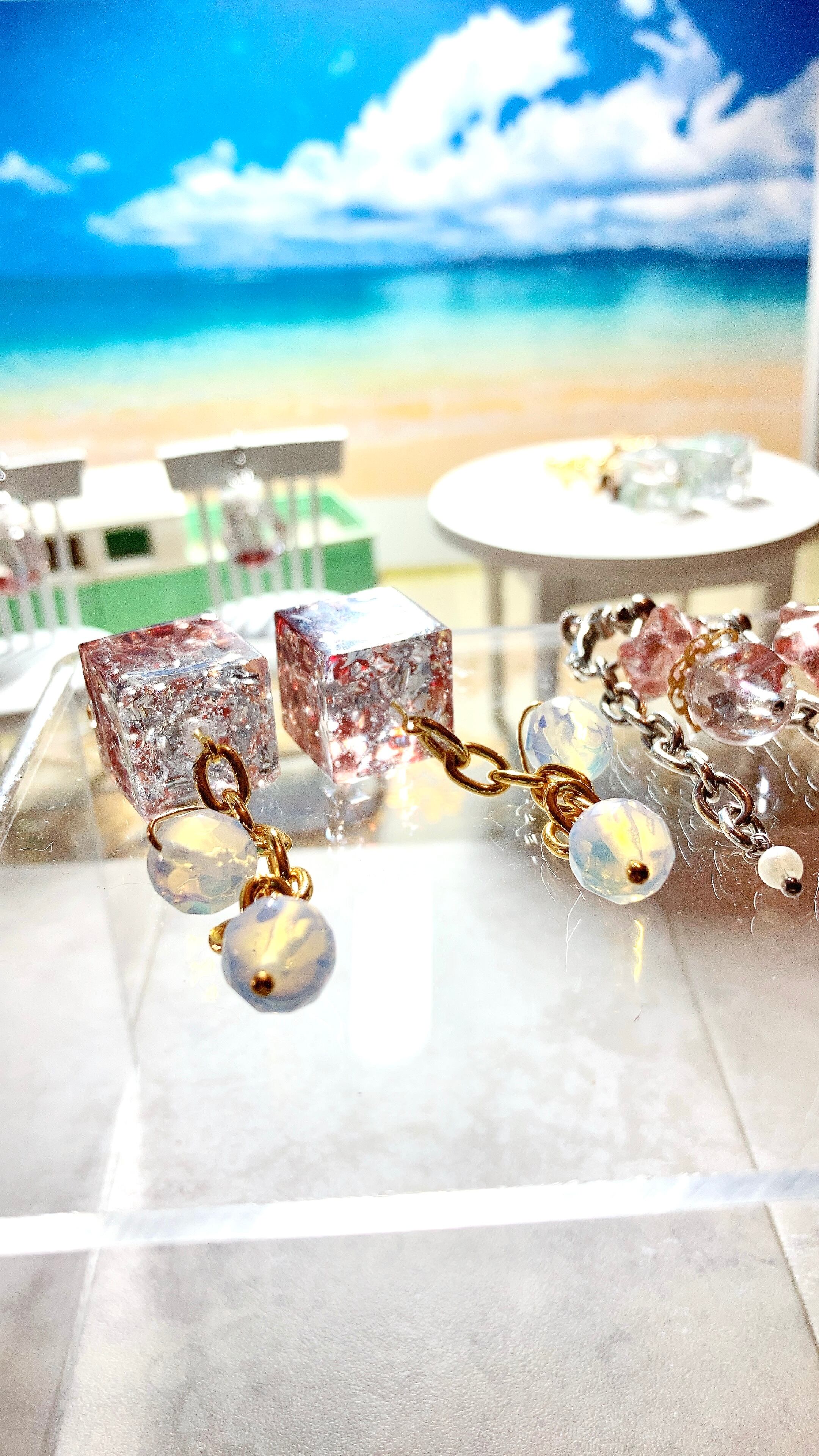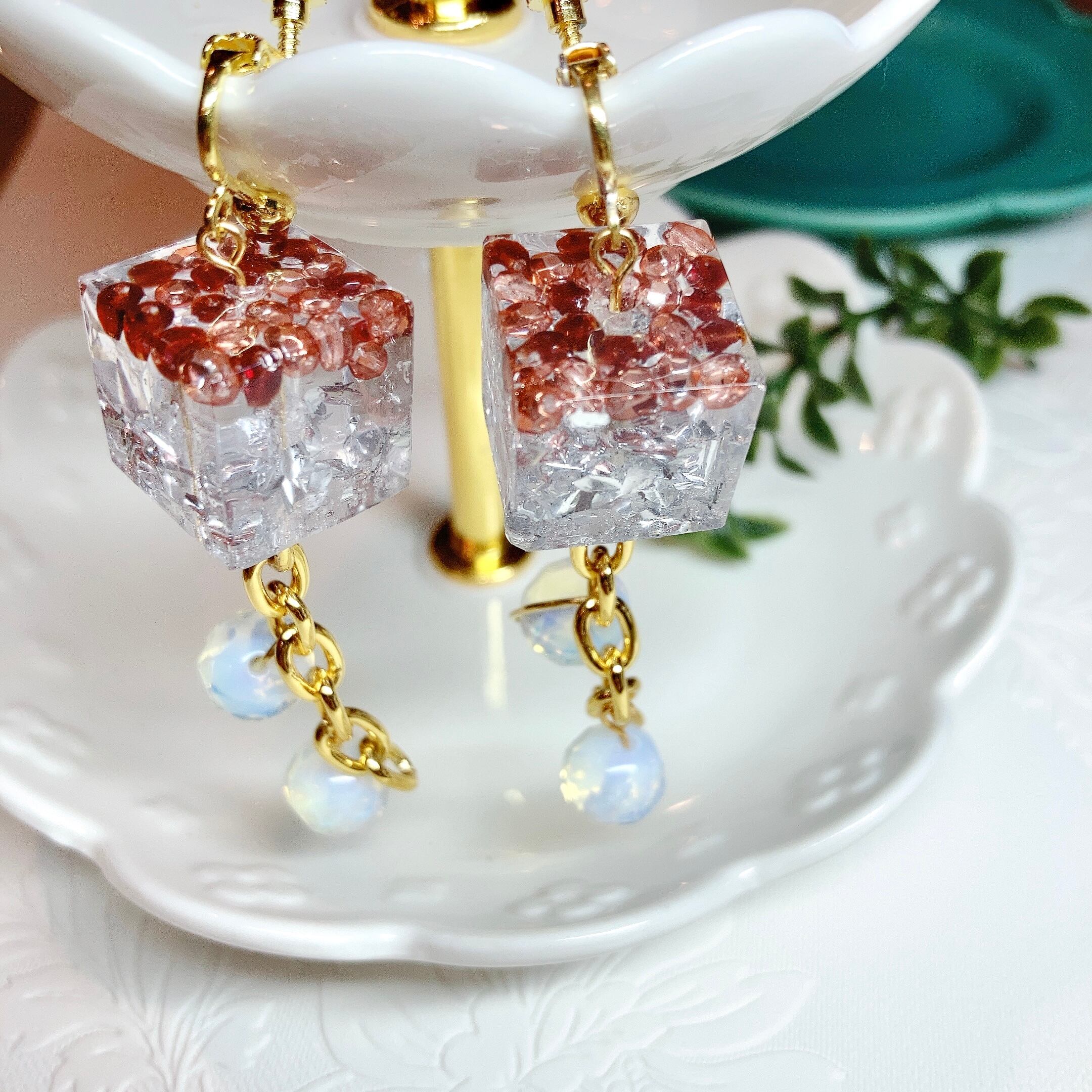 淡いピンクとラズベリー色のチェコビーズ、銀箔、気泡をレジンで閉じ込めたキューブが揺れる、華やかなチェーンイヤリング。ブルーに輝くオパールがアクセントとして輝きます。