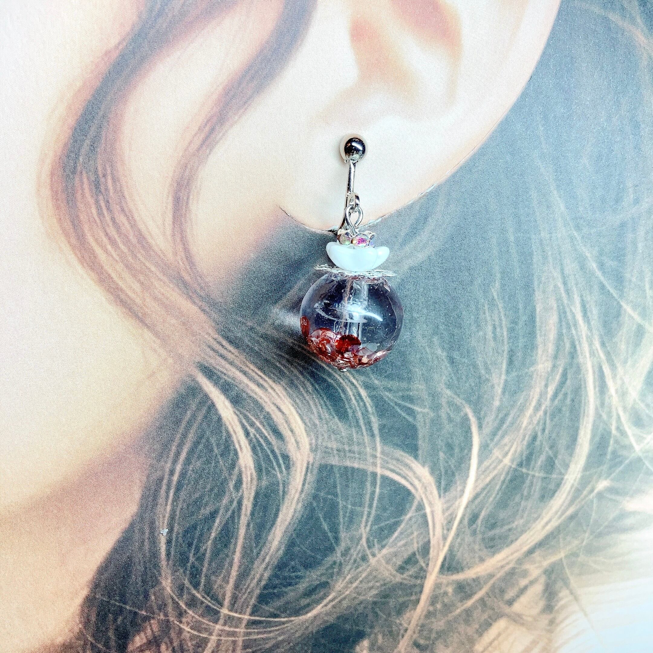 細部までこだわったデザインと手仕事による作りが、このイヤリングの魅力です。丸型のレジンには、チェコ硝子ビーズと銀箔&気泡が閉じ込められており、軽やかで華やかな印象を与えます。幅1.6cm長さ3.3cmというサイズ感は、どんなスタイルにも合わせやすくなっています。