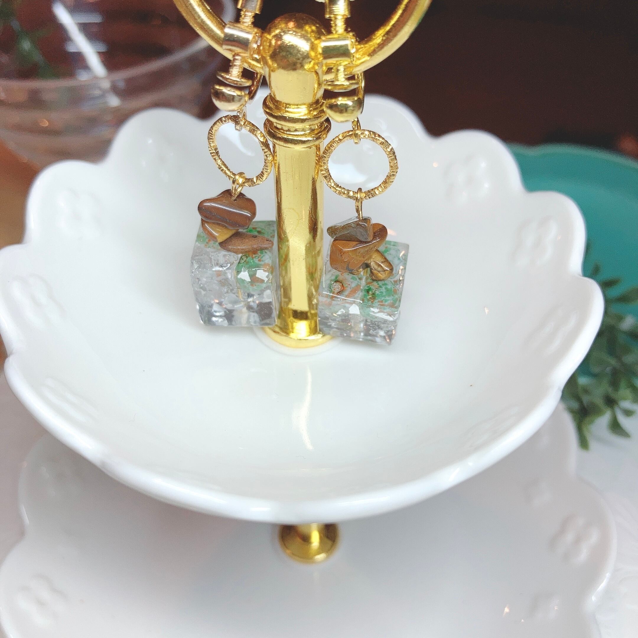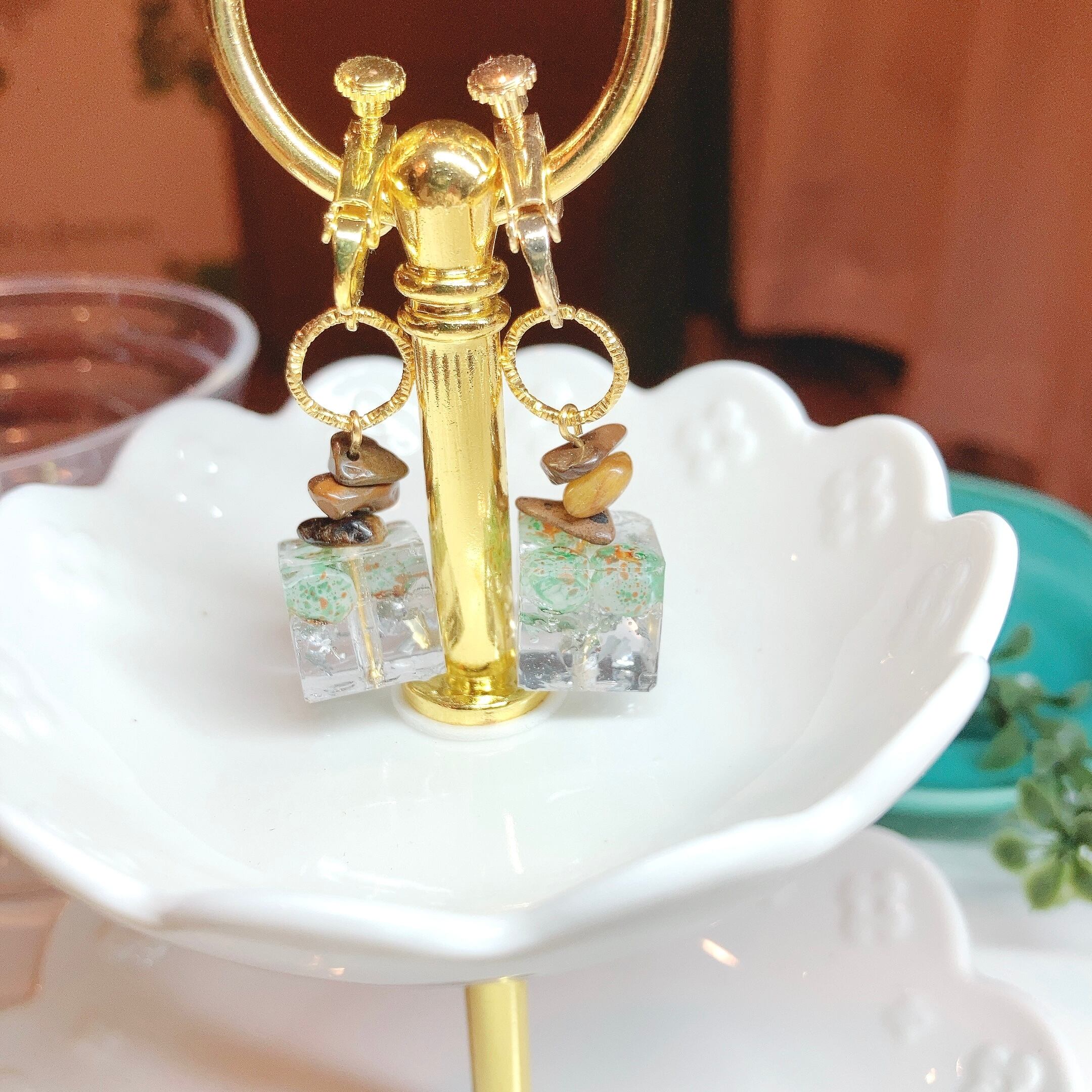 チョコミントタイガーアイのクラッシュビーズ銀箔キューブイヤリング