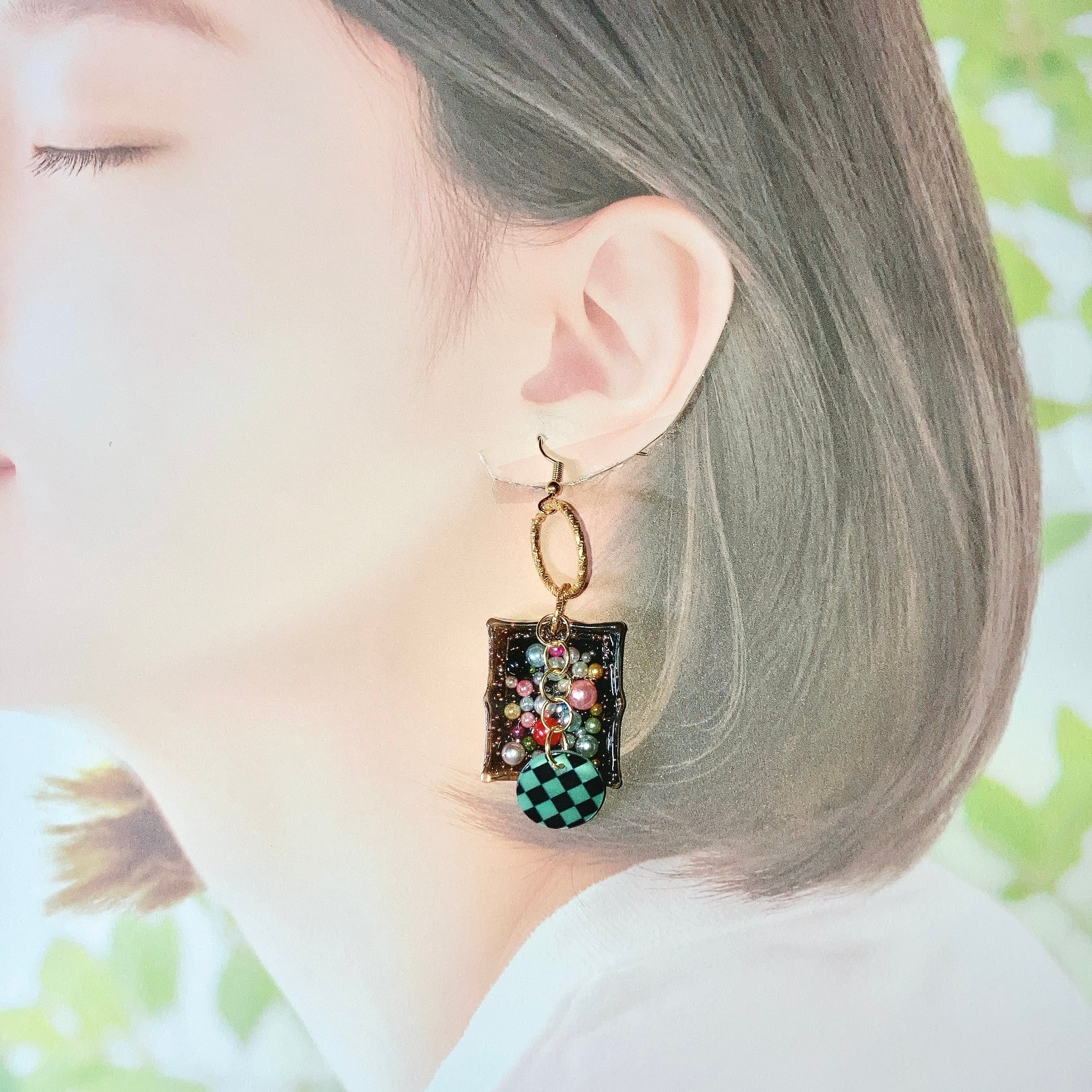 大正時代のレトロな雰囲気をまとった、市松模様チャームが揺れる大正浪漫宝石箱レトロピアス。