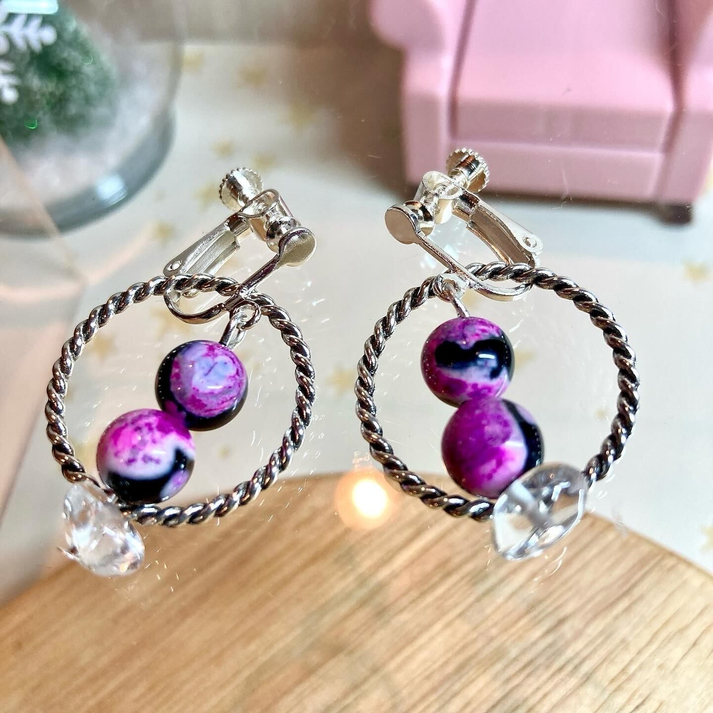 魅力的なフクシア色が特徴のオニキスと水晶の2wayイヤリングです。