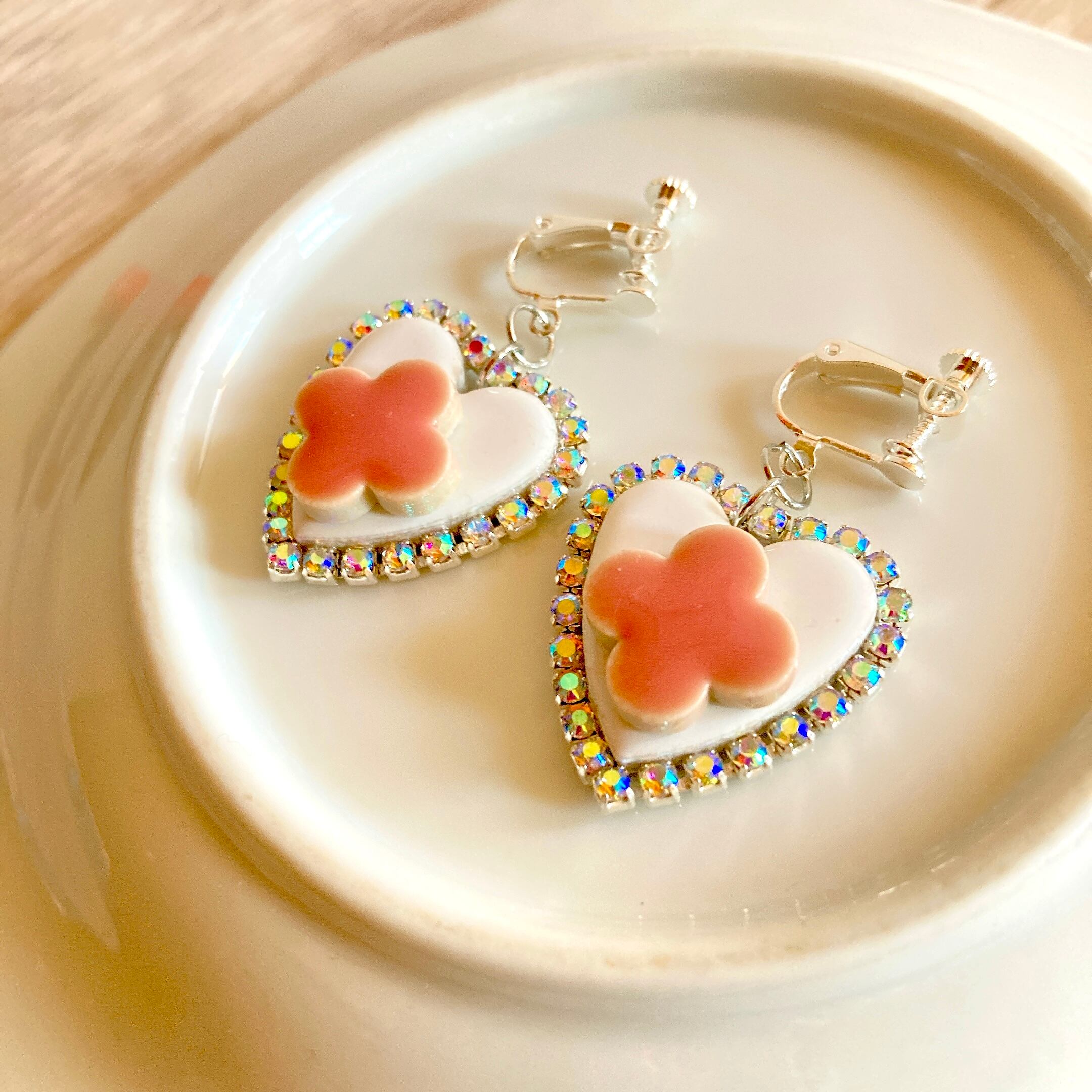 美濃焼タイルのクロスハートイヤリング/ピアス 白×ピンク