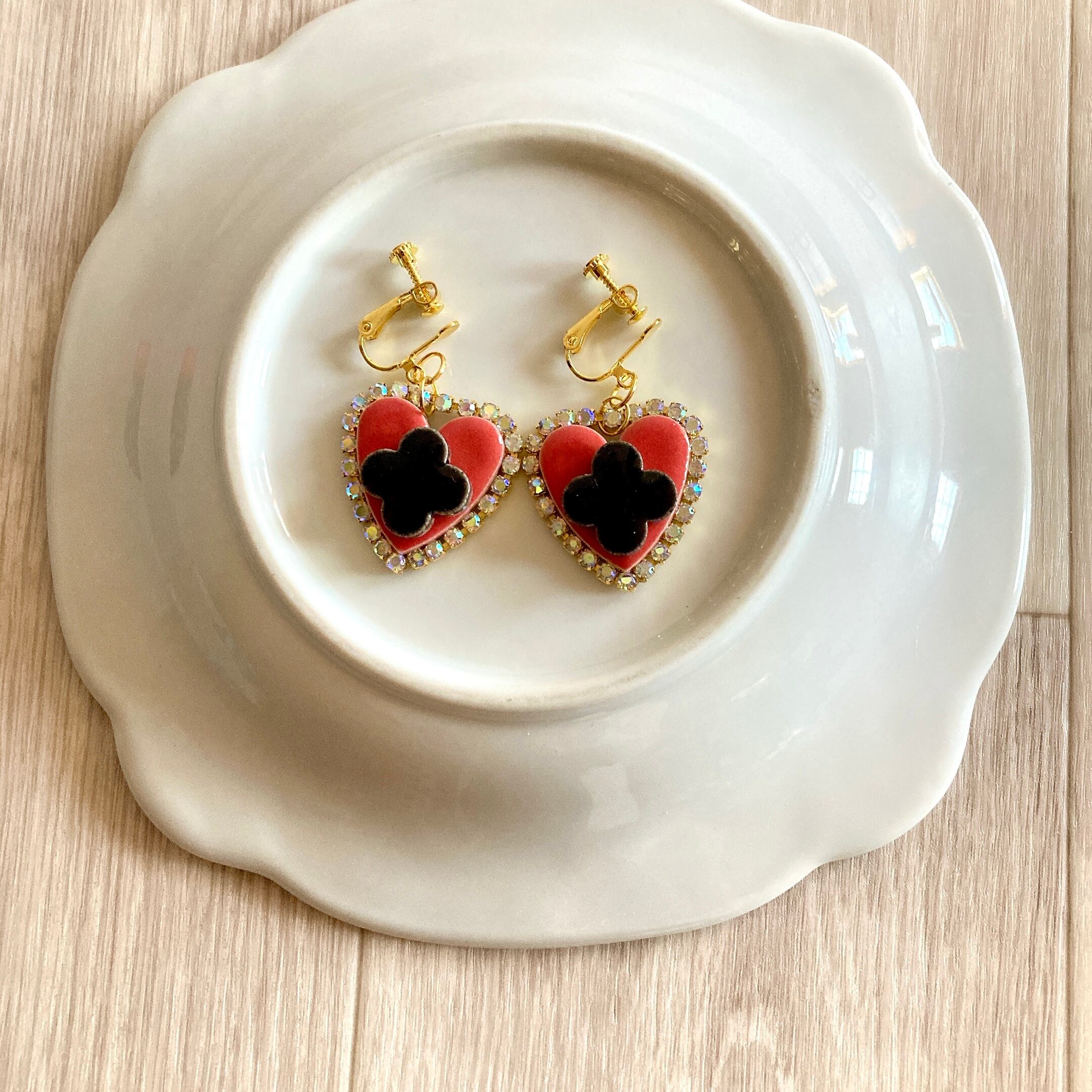 美濃焼タイルのクロスハートイヤリング 黒×赤