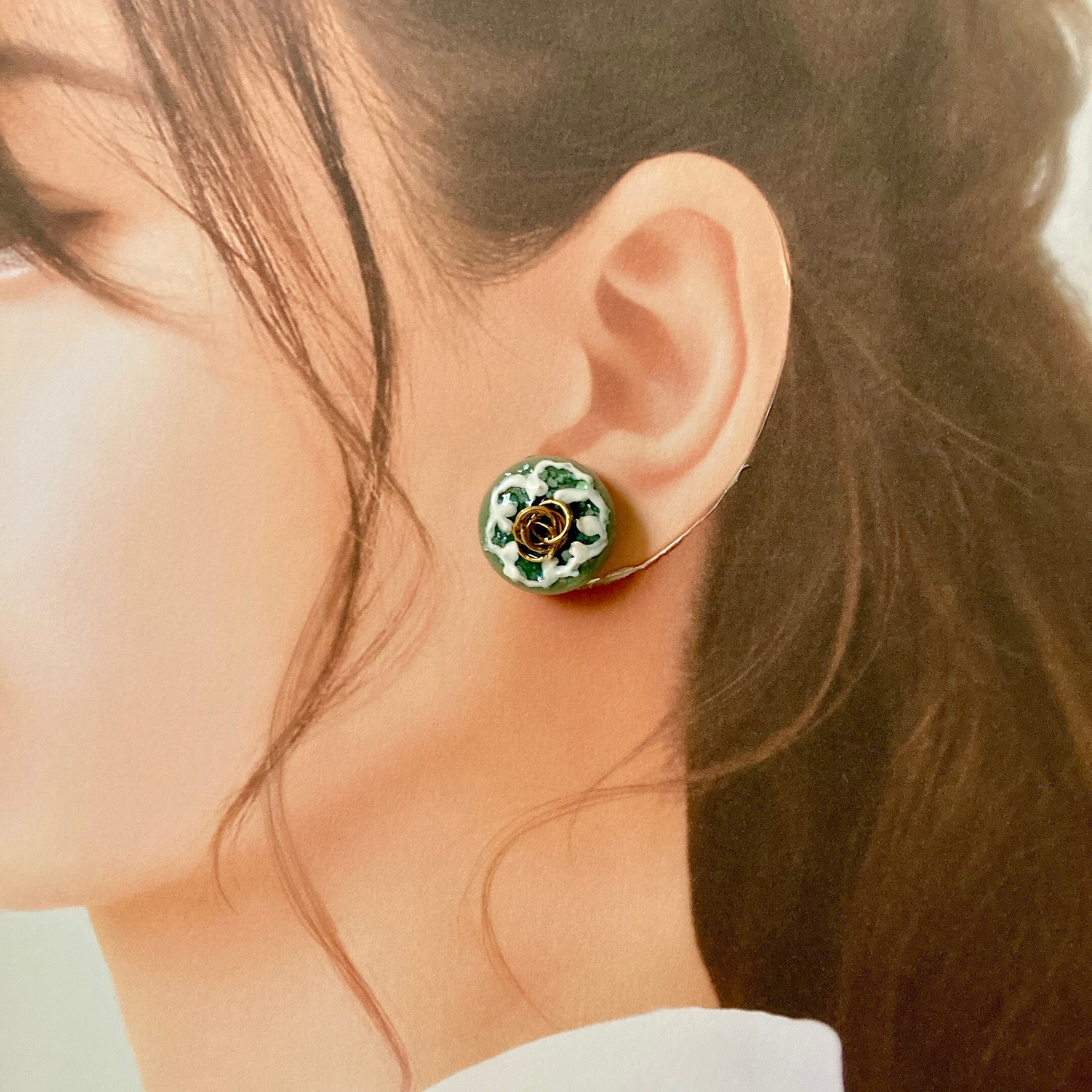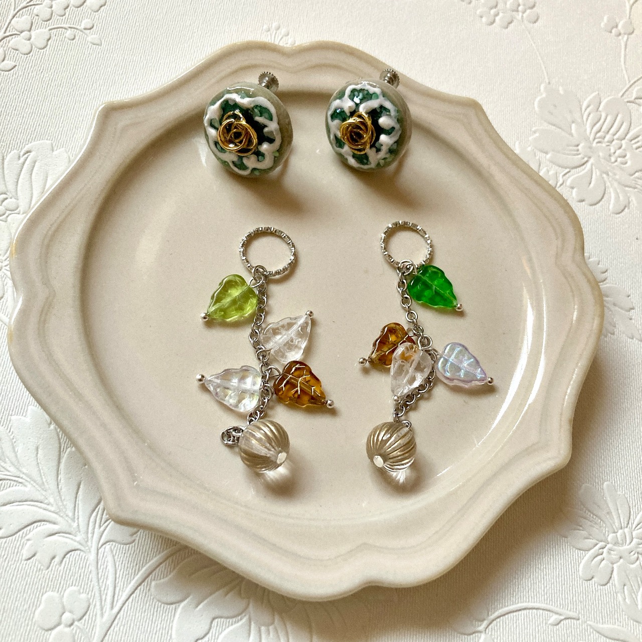 美濃焼の花とチェコビーズの葉部分が取り外し可能な2WAYイヤリング。