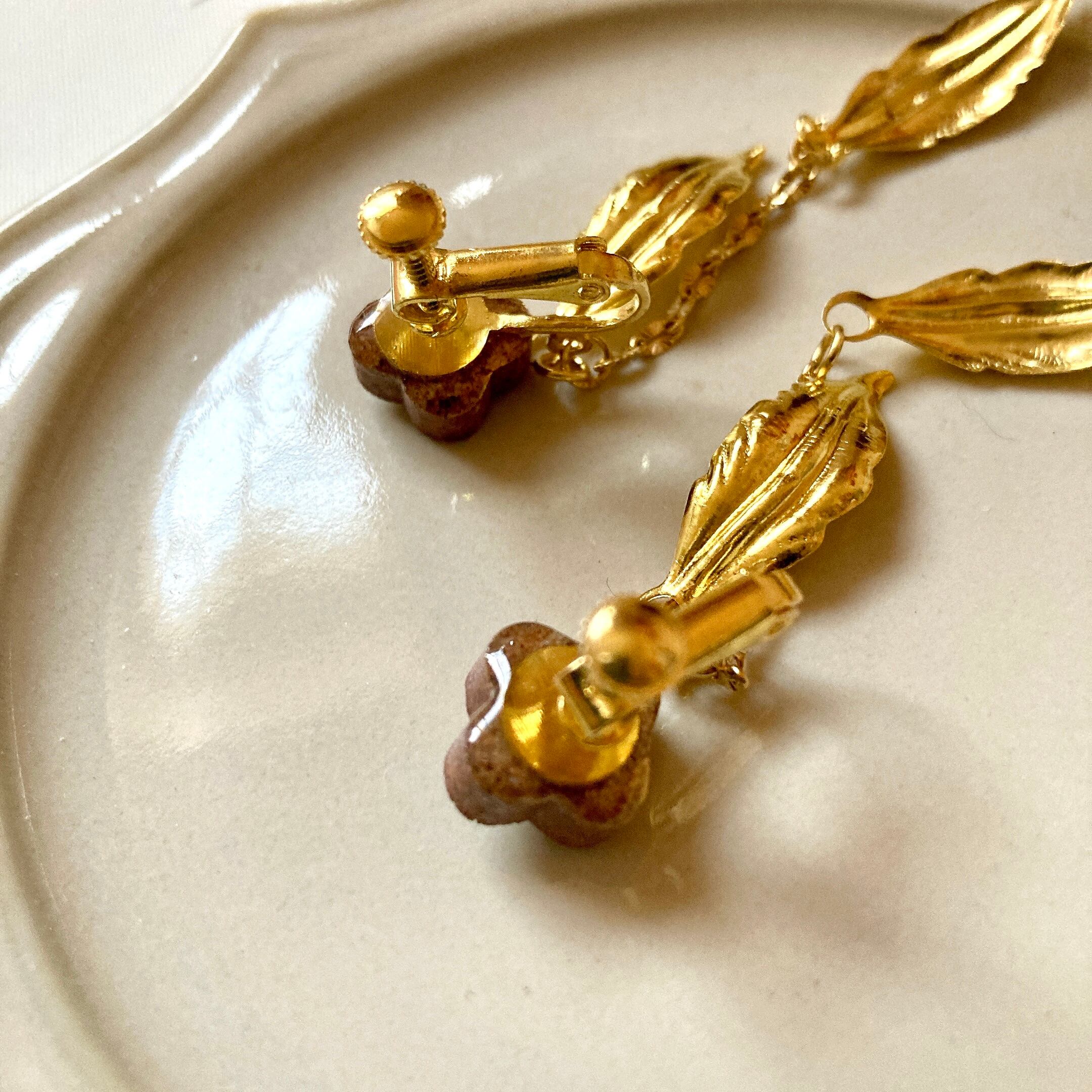 シェル装飾の美濃焼フラワーとゴールドリーフのイヤリング
