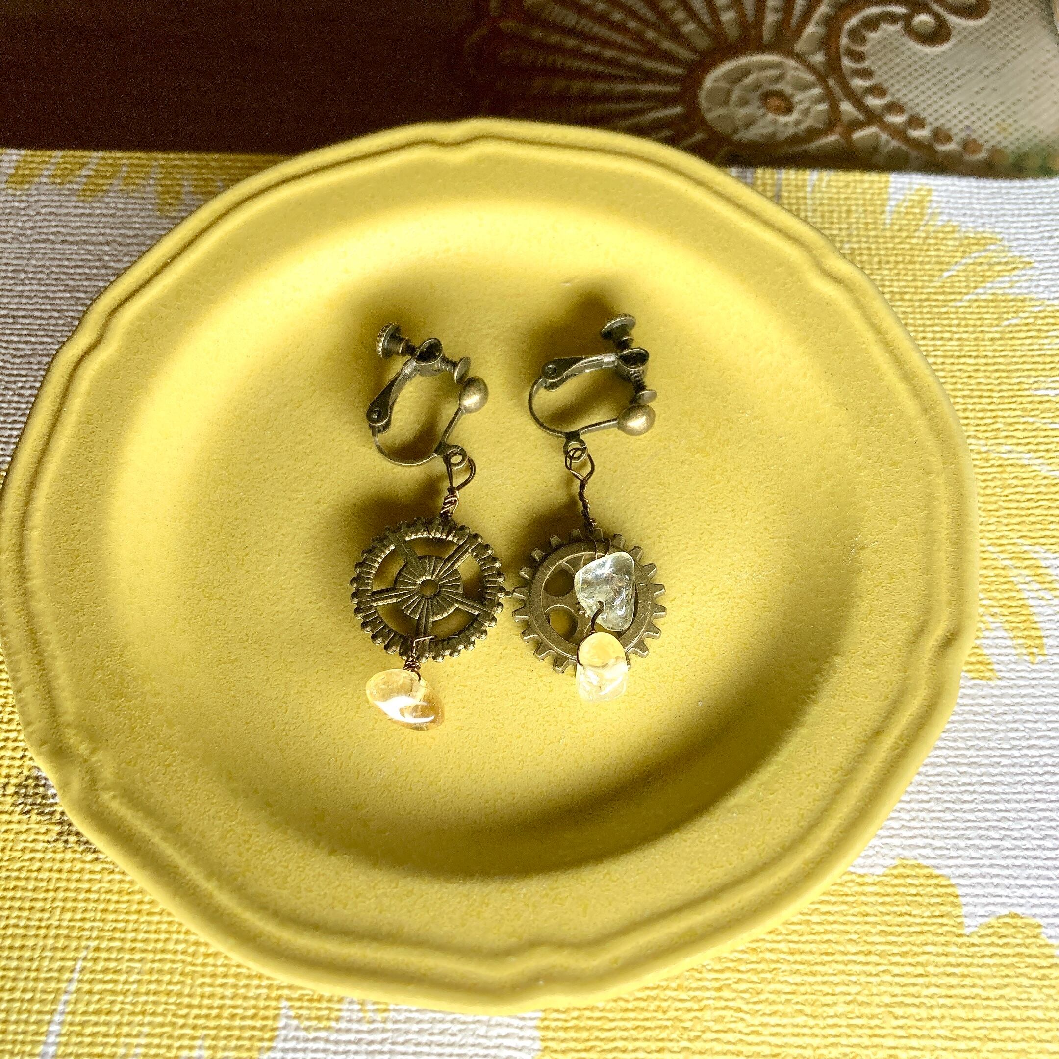 レトロ色の天然石シトリン採掘歯車イヤリング/ピアス