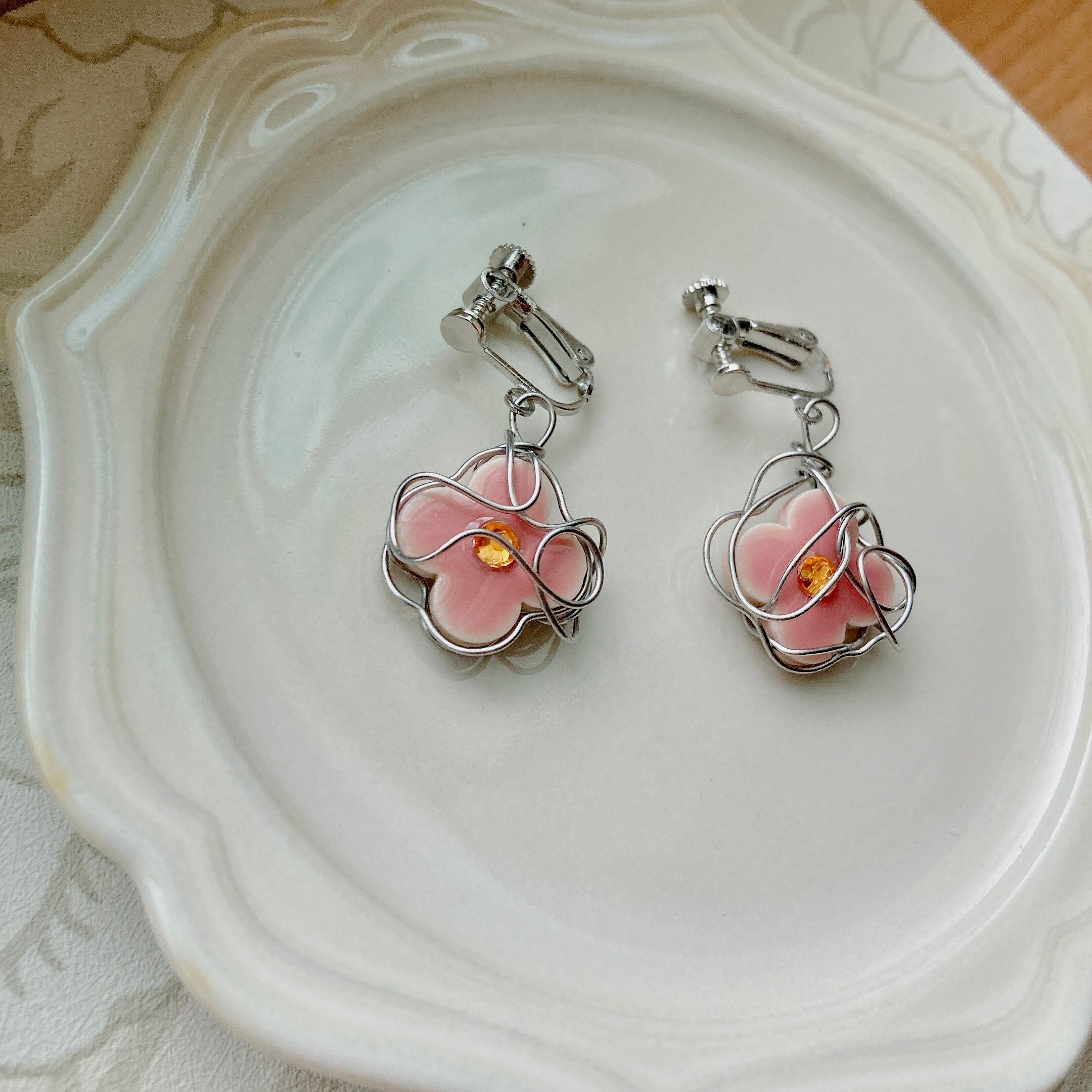 ビジュー輝く美濃焼のピンク花型タイルのワイヤーラッピングイヤリング/ピアス
