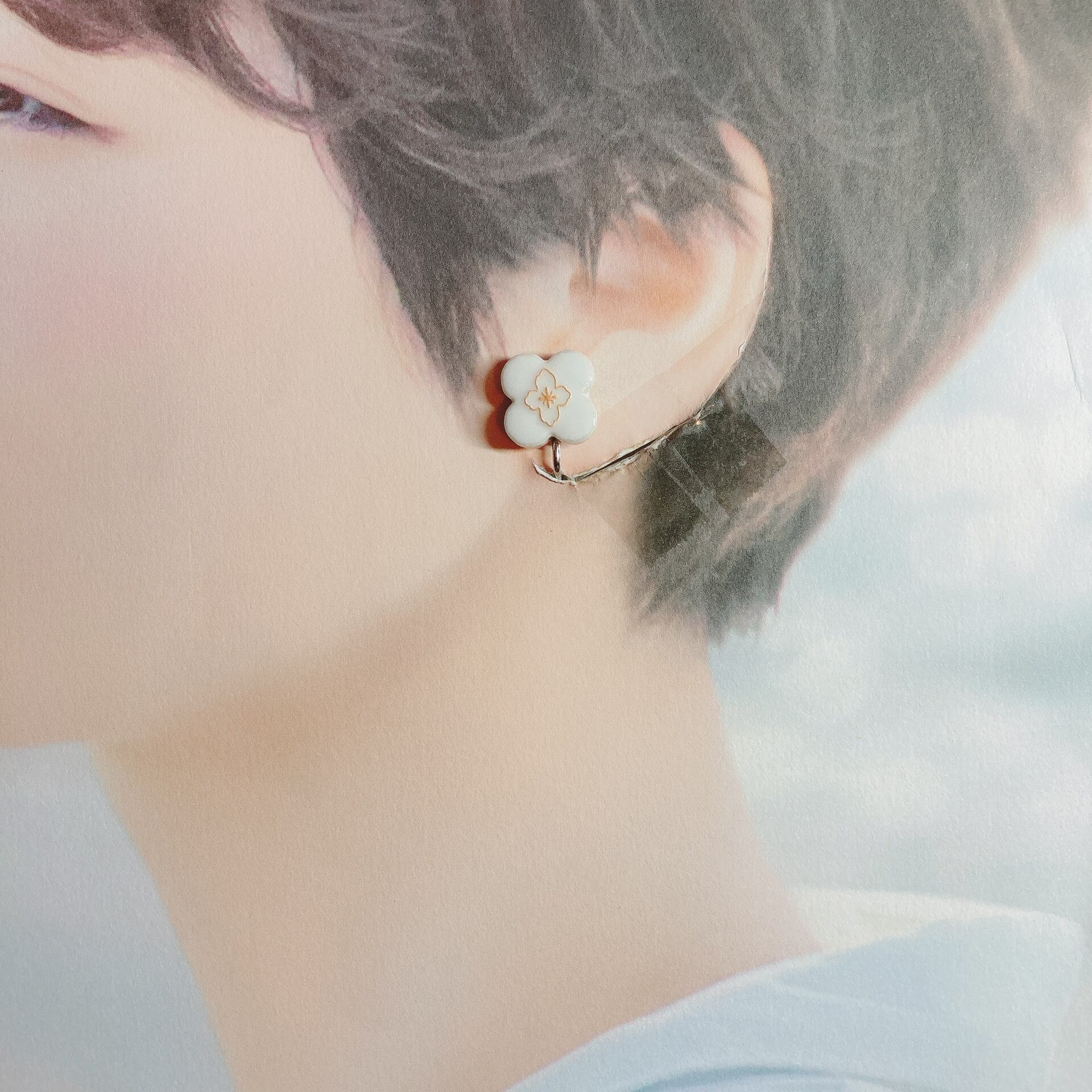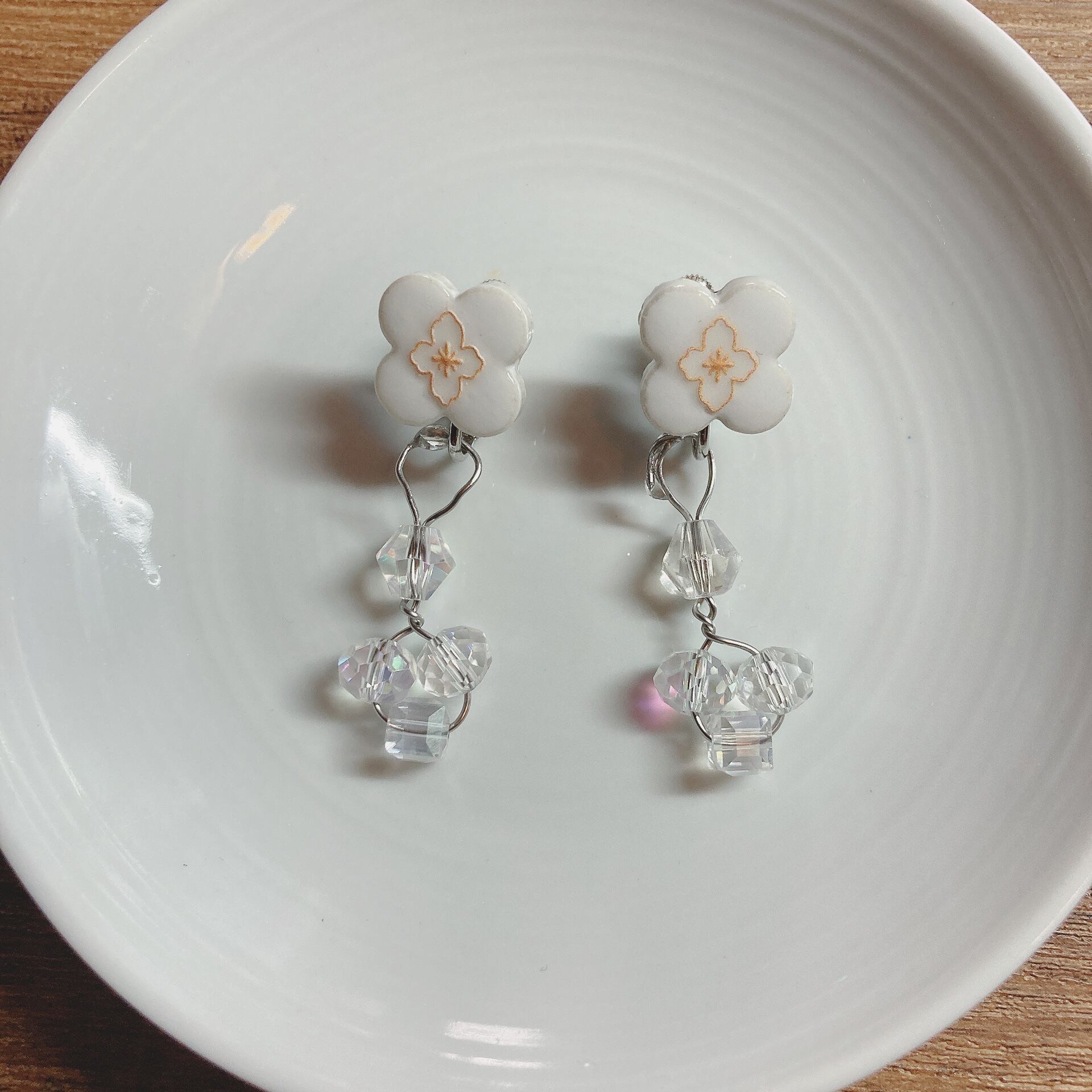 《2WAY》純白美濃焼花タイルのクリスタルオーロラ硝子のイヤリング