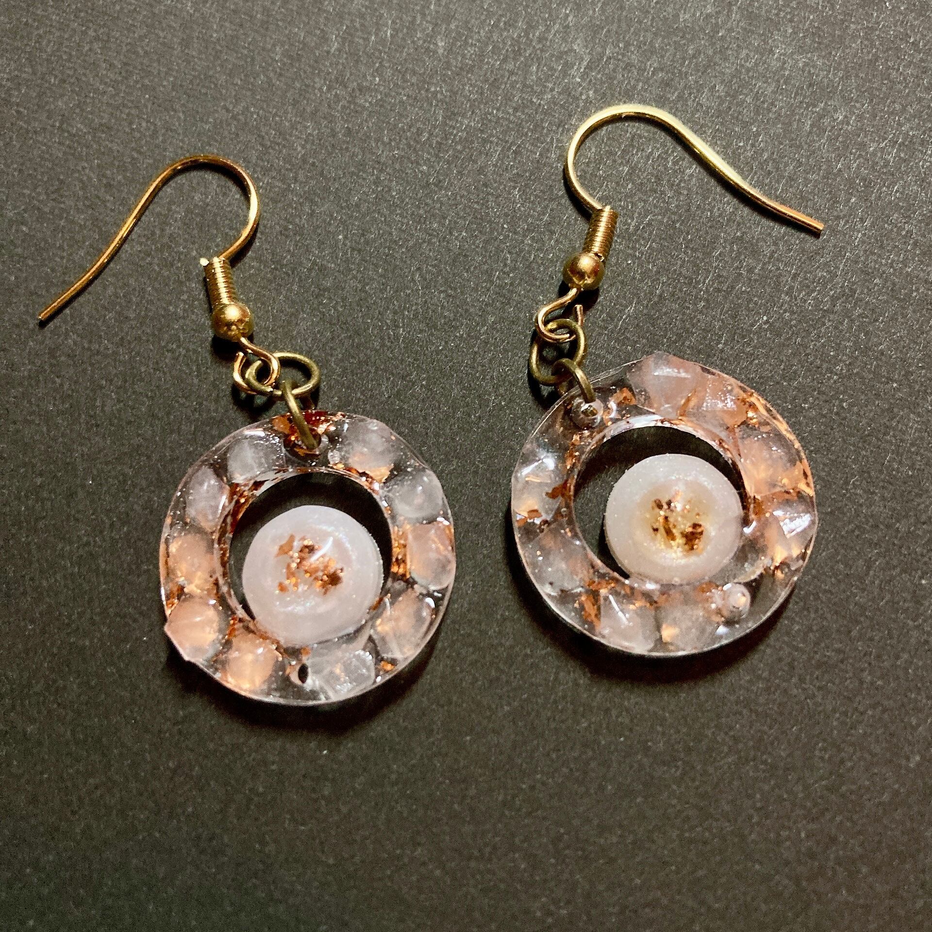 宝石カットのパール色が幻想的な輝きを放つノスタルジックな《パールホワイト》光るフープの宝石カットピアス/イヤリングが登場!パール色の美しい宝石カットが、銅箔と調和して、幻想的でありながらもエレガントな印象を与えます。特徴的なフープのデザインは、見る人の心を惹きつける魅力を持っています。